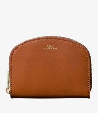 A.P.C. Women's wallet. - Combination coin purse and cardholder in smooth vegetable-tanned leather with a rounded shape. - Goldtone zip closures. - Zip pull engraved A.P.C. - Compartment divided into 2 gusseted pockets. - Each pocket has 3 card slots. - Zip coin pocket in the center. - Leather and cotton lining. - Embossed goldtone 'A.P.C. Rue Madame Paris'. Size Advice - Cotton lining. - Dimensions: 4.72 x 3.93 x 0.78 . - Credit card format cardholder. Composition & Material - 100% leather. - Made in Spain. - Wipe clean with a soft dry cloth.