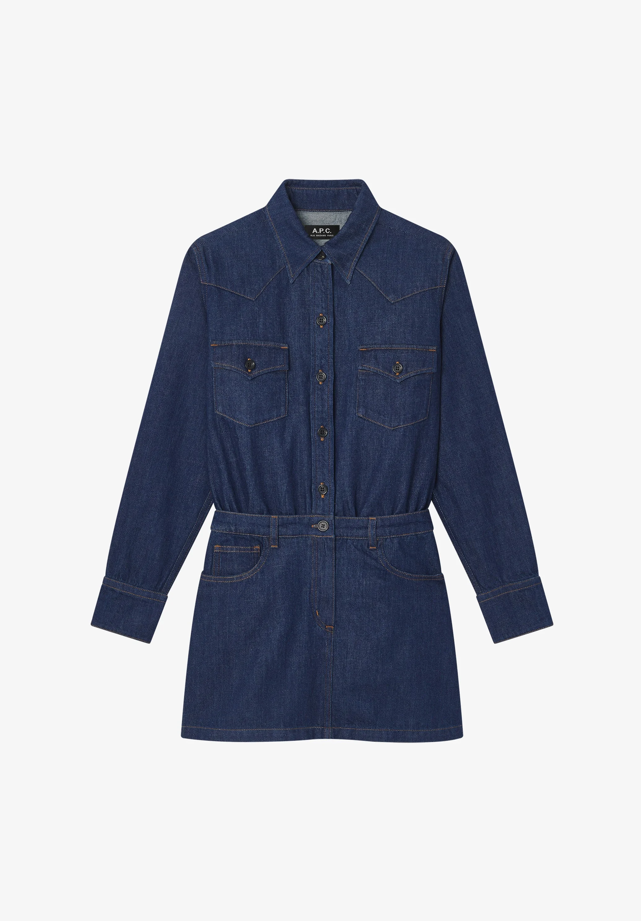 - Straight cut fitted at the waist. - Mid-thigh length. - Classic collar. - Western-style yoke on the shoulders. - Two pointed flap pockets with buttons on the chest. - Faux horn buttons. - Caramel topstitching. - 100% organic cotton. Size Advice - Ebba is 5'11 tall and is wearing size 36. Composition & Material - 100% cotton. - Italian material. - Made in Tunisia. - Machine wash cold (86°F) inside-out.