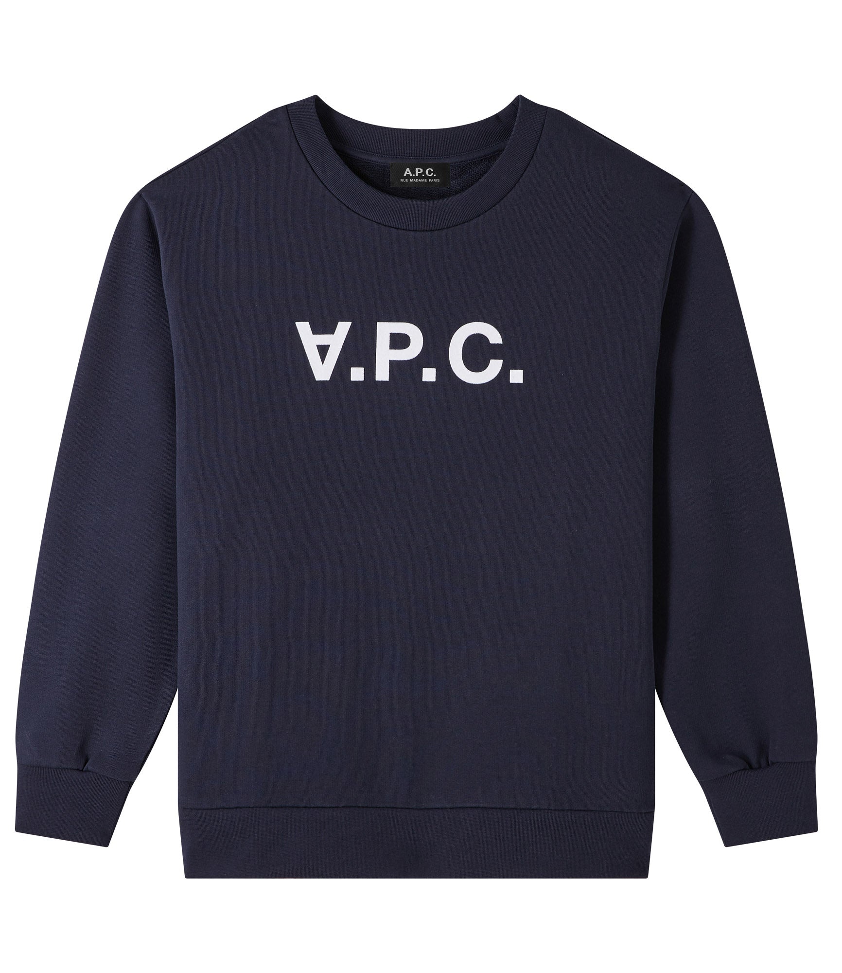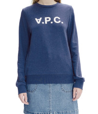 A.P.C. Women's sweatshirt. - Straight loose cut. - Sloping shoulder. - Crew neckline. - Flocked V.P.C. logo with velvet feel. - 100% Cotton from organic farming. Size Advice - Xiaodan Wu is 5'10 tall and is wearing size S. Composition & Material - 100% Cotton. - Made in Portugal. - Portuguese material. - Machine wash 65-85°F inside-out. Our commitments Through its RESPECT program A.P.C reduces (by implementing many practical measures to improve its environmental footprint) regulates (by respecting and enforcing its ethical responsibility on the part of its employees as well as its suppliers) and reuses (through its recycling vintage or quilts and butler programs for example).