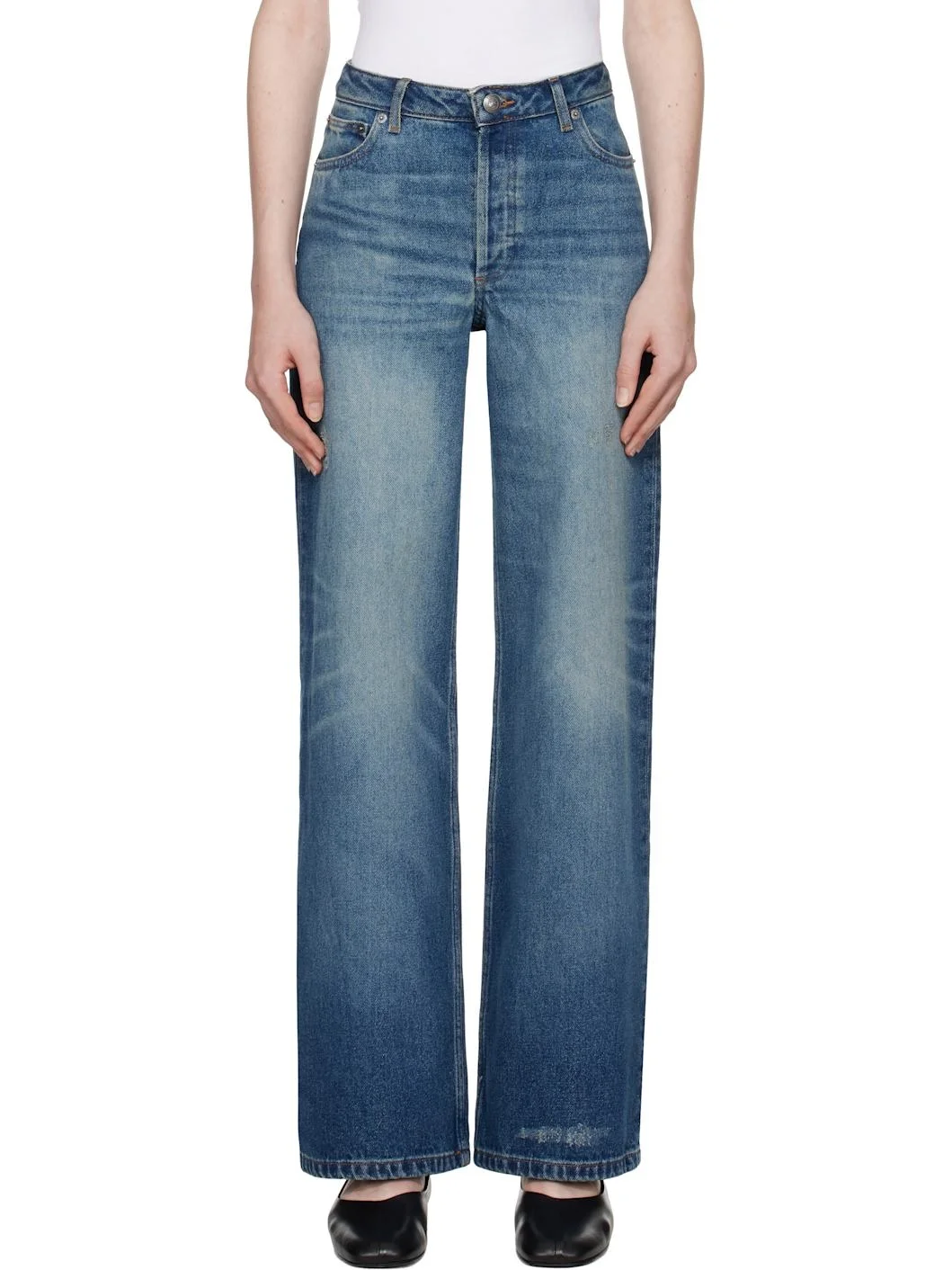 Straight-leg stonewashed non-stretch denim jeans. Fading, whiskering, and subtle distressing throughout. · High-rise · Belt loops · Five-pocket styling · Button fly · Logo-engraved antiqued silver-tone hardware · Contrast stitching in tan Supplier color: Stonewashed indigo 100% cotton. Made in Egypt 251252F069006