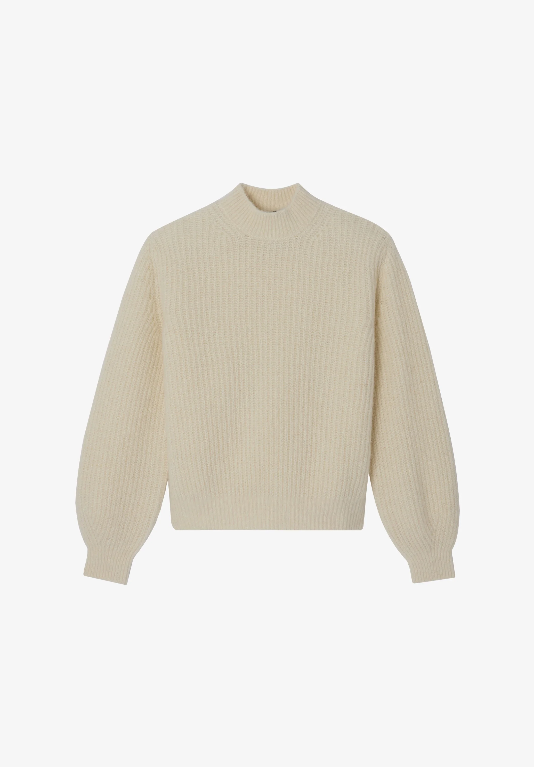 - Soft warm material. - Loose fit. - High collar. - Slightly ballooned sleeves. - Sloping shoulders. - 25% recycled material. Size Advice - Grace is 5'10 tall and is wearing size S. Composition & Material - 65% alpaca. 25% polyamide. 10% wool. - Italian material. - Made in Romania. - Hand wash or delicate cycle.
