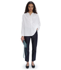 PRODUCT DETAILS Straight cut. Officer collar. Six front buttons with detail at last button. FABRIC & CARE - 100% Cotton. - Italian material. - Made in Bulgaria. - Dry clean. SIZE Naomie is 5'8" tall and is wearing size 36. This model fits true to size; choose your usual size.