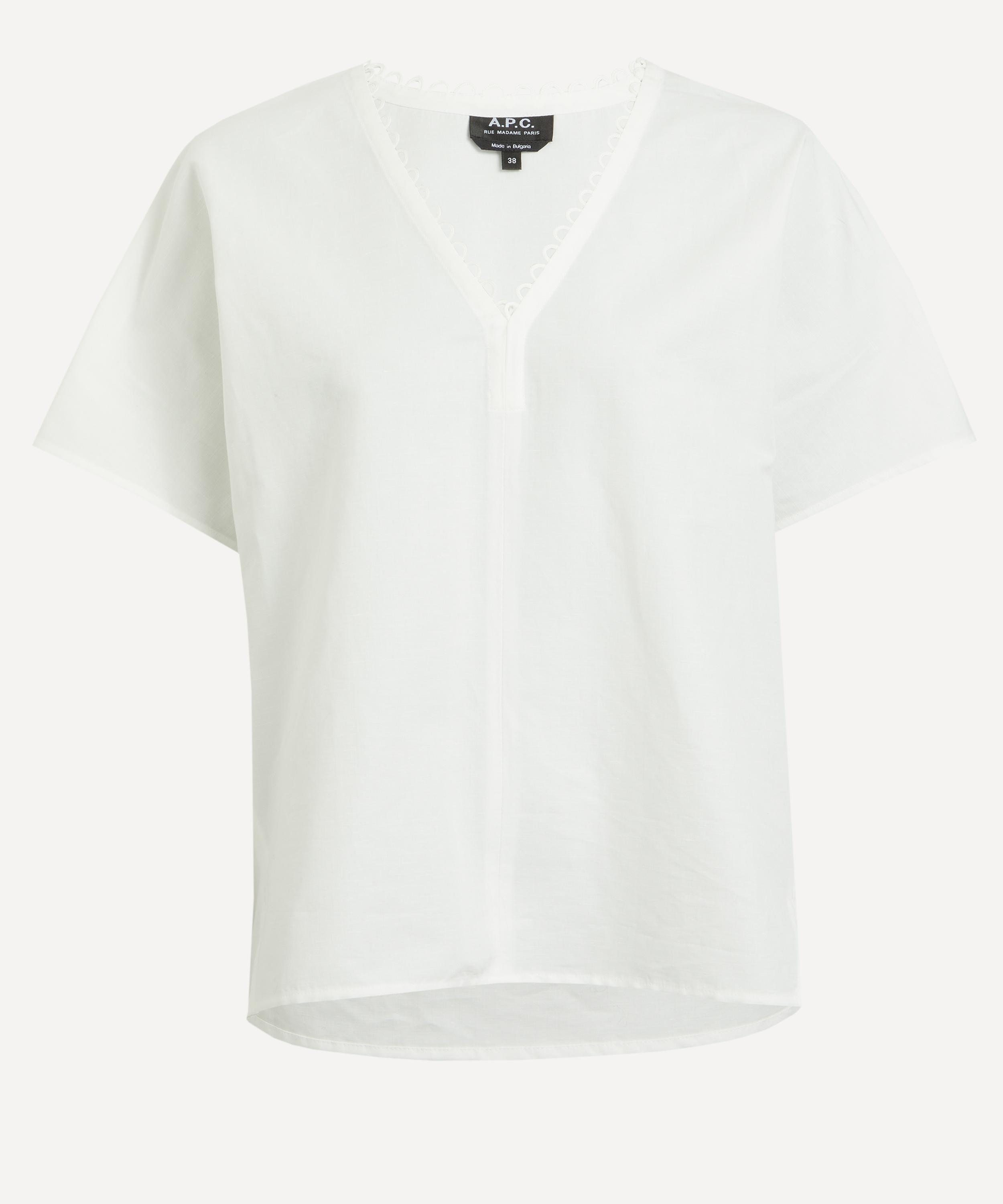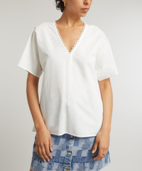 DETAILS Freja blouse V-neck Cotton linen blend Loose fit Crochet embroidery Hem longer to the back Small side slits Thick material with slight roughness from linen content SIZE & FIT Model is 178cm/5'10"; Chest: 84cm; Waist: 63cm; Hip: 93cm and wears a size 8 COMPOSITION & CARE 74% Cotton; 26% Linen Dry clean