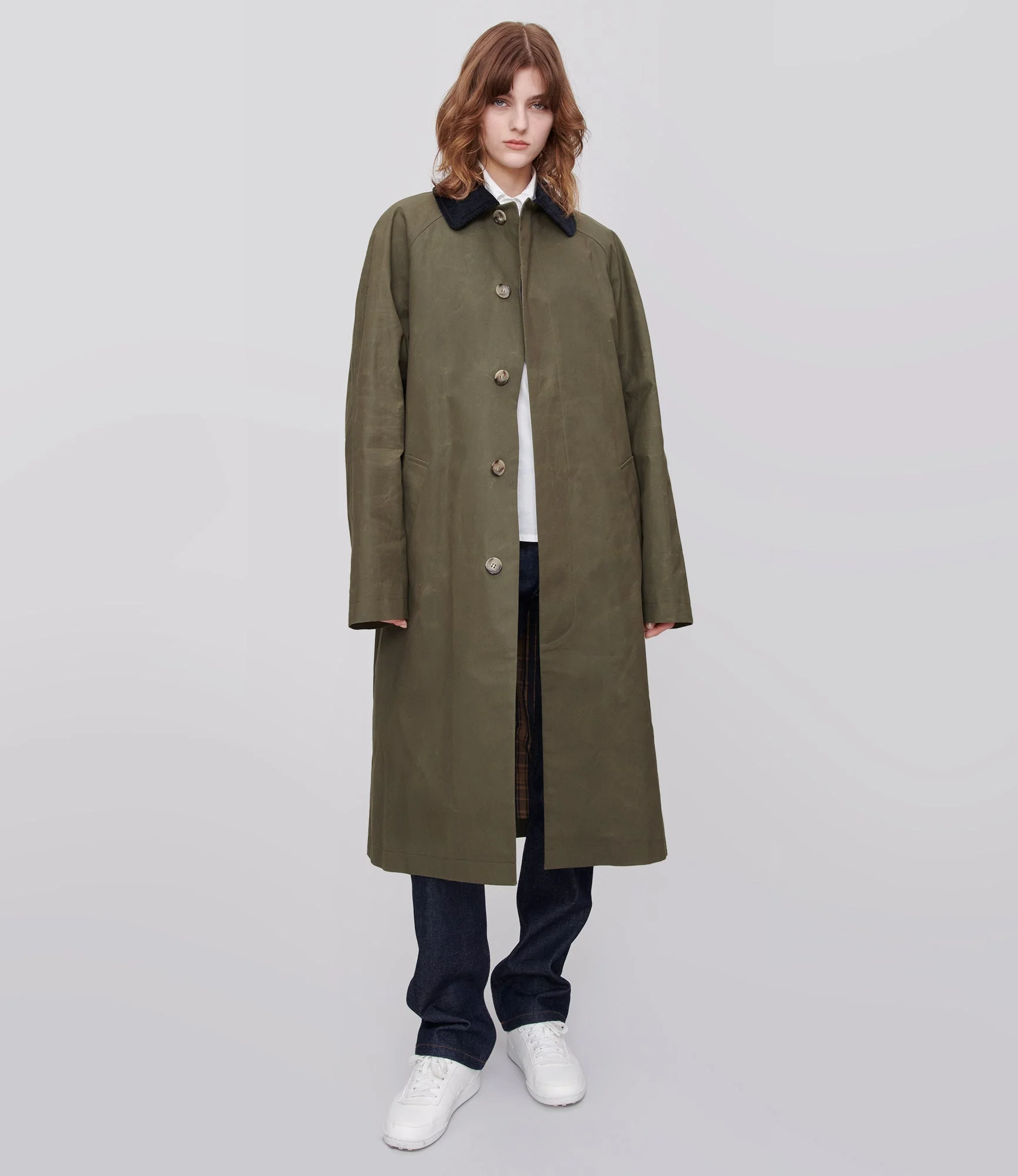 - Unisex piece. - Water-repellent English waxed cotton. - Straight cut. - Knee length. - Classic corduroy collar. - Raglan sleeves. - Hidden faux horn buttons. - Two side pockets. Size Advice - Matilda is 5'9 tall and is wearing size XS. - For women we recommend that you order one size smaller than usual. Composition & Material - 100% cotton. - English material. - Made in Romania. - Dry clean only.