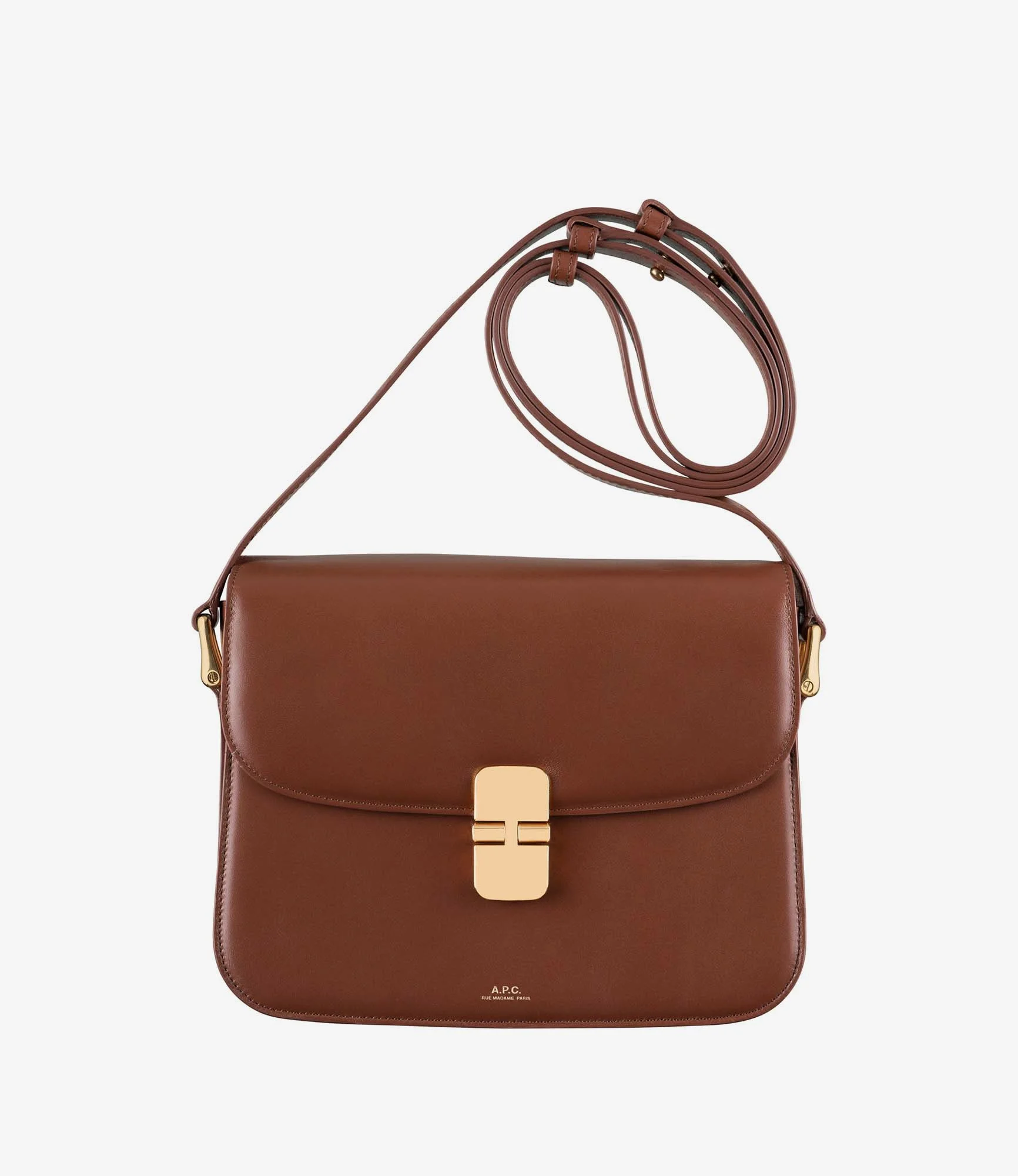 A.P.C. Women's bag. - Supple cowhide leather. - Adjustable leather shoulder strap. - Can be worn on the shoulder or across the chest. - Goldtone hardware clasp. - Flap lined in cowhide suede split. - One large compartment. - Two large pockets. - Two goldtone rings on sides. - Embossed goldtone 'A.P.C. Rue Madame Paris' logo. Size Advice - Cotton lining. - Dimensions: 9.8 x 7.9 x 2.4. - Larger version of the Grace Small bag and Grace Mini bag. Composition & Material - 100% cowhide leather. - Spanish material. - Made in Morocco. - Care instructions: wipe with a soft dry cloth.