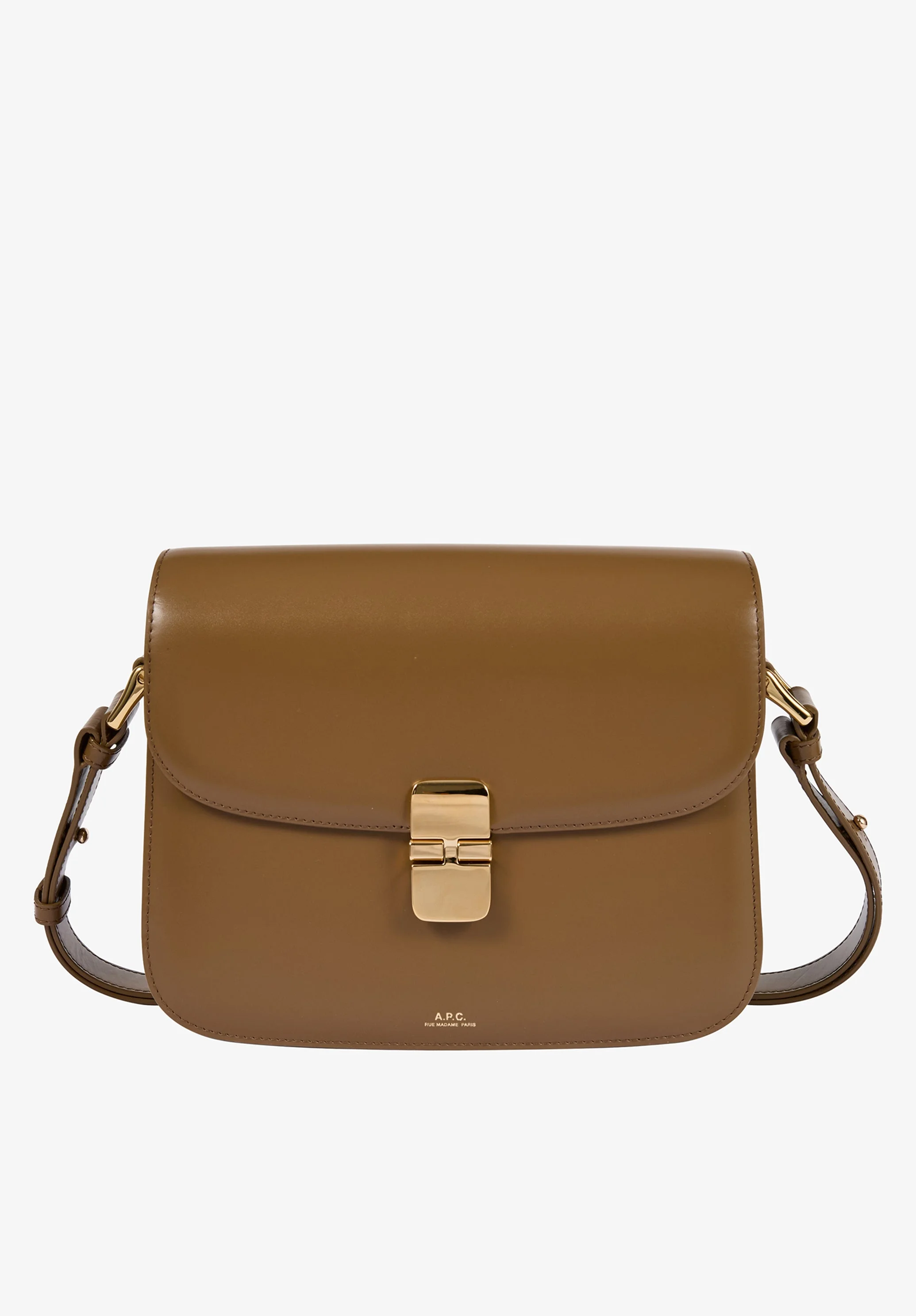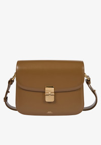 - Leather bag inspired by chic vintage bags. - Supple cowhide leather. - Adjustable leather shoulder strap. - Can be worn on the shoulder or across the chest. - Goldtone clasp. - Flap lining in cowhide suede split. - One large compartment. - Two large pockets. - Two goldtone rings on the sides. - Embossed goldtone A.P.C. Rue Madame Paris logo. Size Advice - Cotton lining. - Dimensions: 24.5 x 20 x 6 cm. - Carrying height from 36 to 49 cm. - Bigger version of the Grace Small bag and Grace Mini bag. Composition & Material - 100% cowhide leather. - Spanish material. - Made in Morocco. - Care instructions: wipe with a soft dry cloth. - Avoid poor weather conditions which can potentially damage the leather.