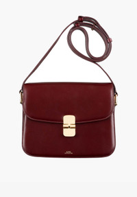 A.P.C. Women's bag. - Supple cowhide leather. - Adjustable leather shoulder strap. - Can be worn on the shoulder or across the chest. - Goldtone hardware clasp. - Flap lined in cowhide suede split. - One large compartment. - Two large pockets. - Two goldtone rings on sides. - Embossed goldtone 'A.P.C. Rue Madame Paris' logo. Size Advice - Cotton lining. - Dimensions: 9.8 x 7.9 x 2.4. - Larger version of the Grace Small bag and Grace Mini bag. Composition & Material - 100% cowhide leather. - Spanish material. - Made in Morocco. - Care instructions: wipe with a soft dry cloth.