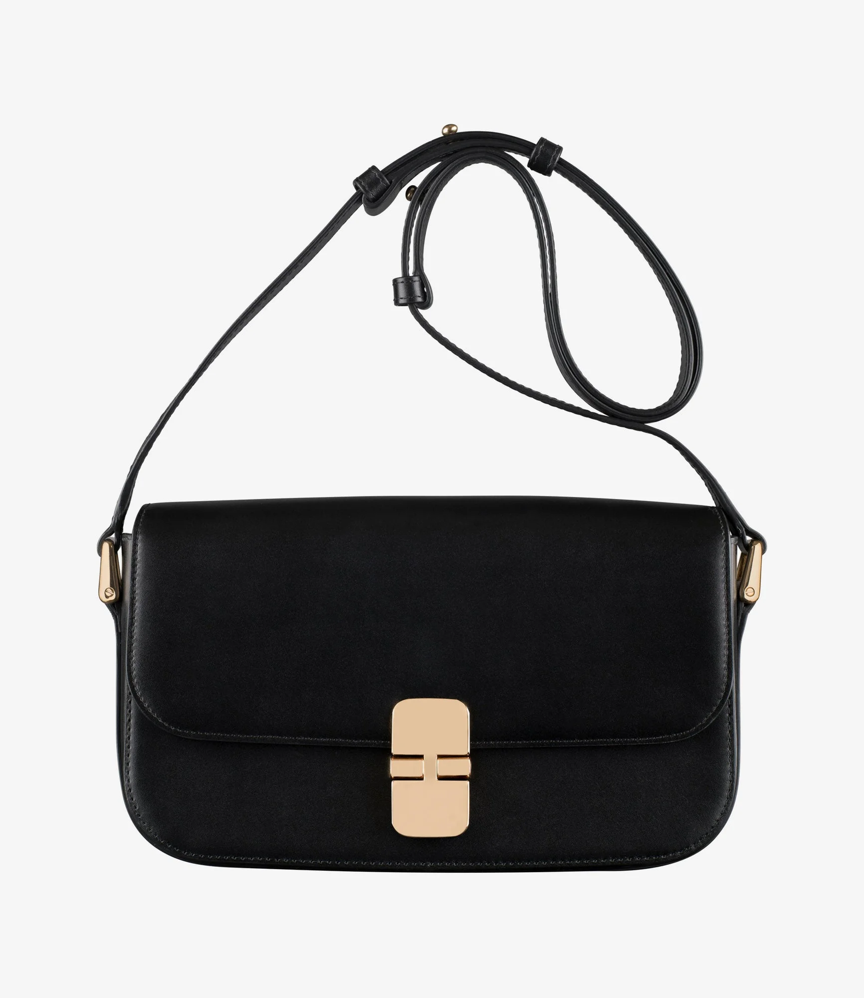 A.P.C. Women's bag. - Adjustable leather shoulder strap. - Can be worn on the shoulder or across the chest. - Goldtone hardware clasp. - One interior pocket. - Embossed goldtone 'A.P.C. Rue Madame Paris' logo. Size Advice - Dimensions: 9.8 x 5.9 x 2 inches. - Strap: 10.2 and 13.8 inches. Composition & Material - 100% leather. - Spanish material. - Made in Morocco. - Care instructions: wipe with a soft dry cloth.