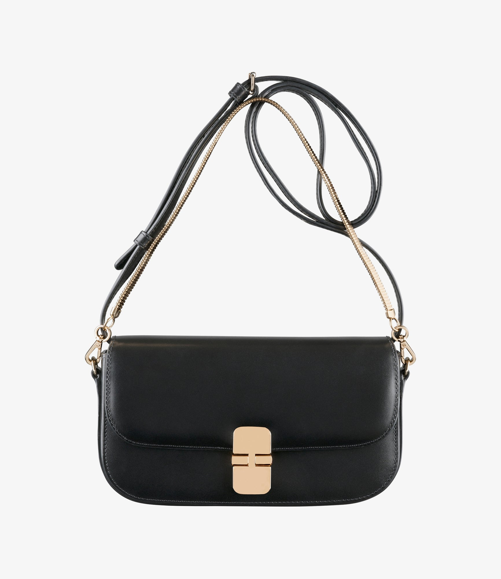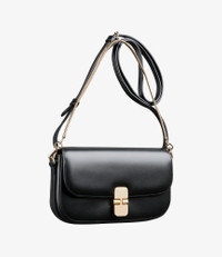 PRODUCT DETAILS A.P.C. Women's bag. - Leather bag inspired by chic vintage clutch bags. - Adjustable leather shoulder strap. - Can be worn on the shoulder or across the chest. - One goldtone chain to carry the bag by hand. - Leather closure tab with goldtone hardware clasp. - One large compartment. - Four card slots inside. - Two goldtone rings on the sides. - Embossed goldtone 'A.P.C. Rue Madame Paris' logo in back. FABRIC & CARE - 100% cowhide leather. - Spanish material. - Made in Morocco. - Care instructions: wipe with a soft, dry cloth. SIZE - Interior cotton lining. - Dimensions: 7.9 x 4.5 x 1.2". - Inspired by the Grace line.