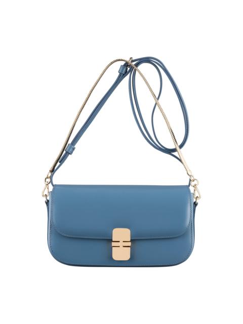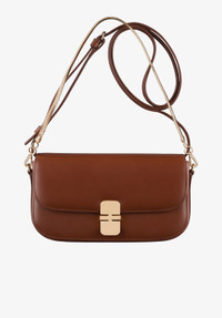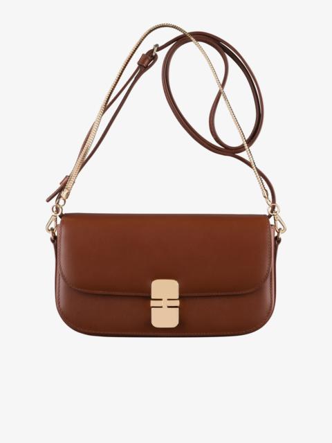 PRODUCT DETAILS A.P.C. Women's bag. - Leather bag inspired by chic vintage clutch bags. - Adjustable leather shoulder strap. - Can be worn on the shoulder or across the chest. - One goldtone chain to carry the bag by hand. - Leather closure tab with goldtone hardware clasp. - One large compartment. - Four card slots inside. - Two goldtone rings on the sides. - Embossed goldtone 'A.P.C. Rue Madame Paris' logo in back. FABRIC & CARE - 100% cowhide leather. - Spanish material. - Made in Morocco. - Care instructions: wipe with a soft, dry cloth. SIZE - Interior cotton lining. - Dimensions: 7.9 x 4.5 x 1.2". - Inspired by the Grace line.