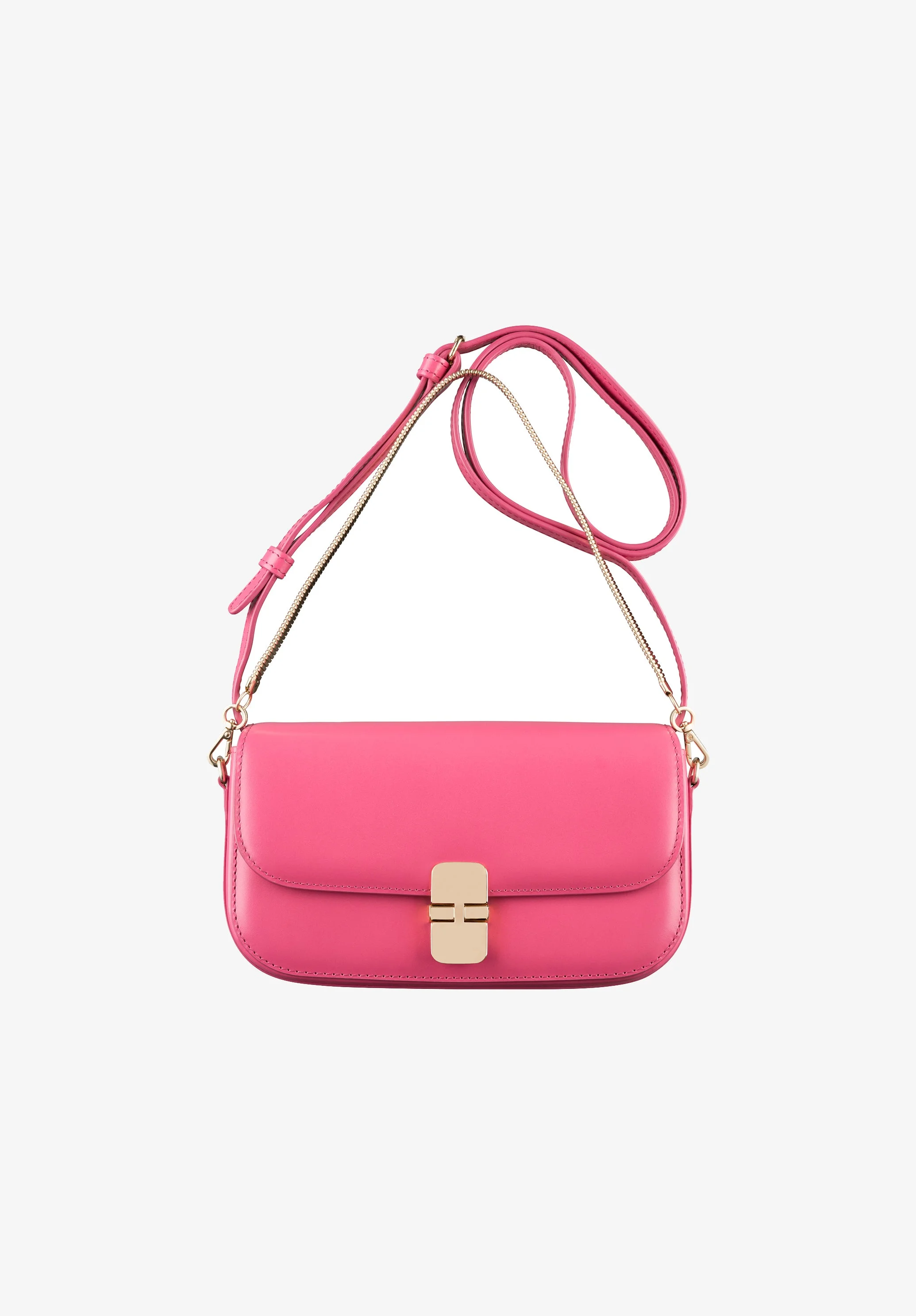 - Bag in smooth vegetable-tanned leather. - Signature goldtone clasp of the Grace line. - Two interior pockets. - Adjustable leather shoulder strap to wear the bag on the shoulder or across the chest. - Metal handle to carry the bag by hand. - Flap lining in cowhide suede split. - Embossed goldtone 'A.P.C. Rue Madame Paris' logo. Size Advice - Interior cotton lining. - Dimensions: 7.9 x 4.5 x 1.2. - Inspired by the Grace line. Composition & Material - 100% cowhide leather. - Spanish material. - Made in Morocco. - Care instructions: wipe with a soft dry cloth.