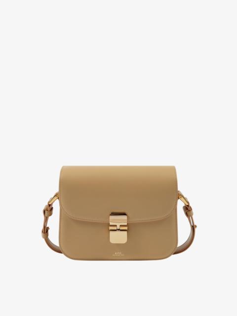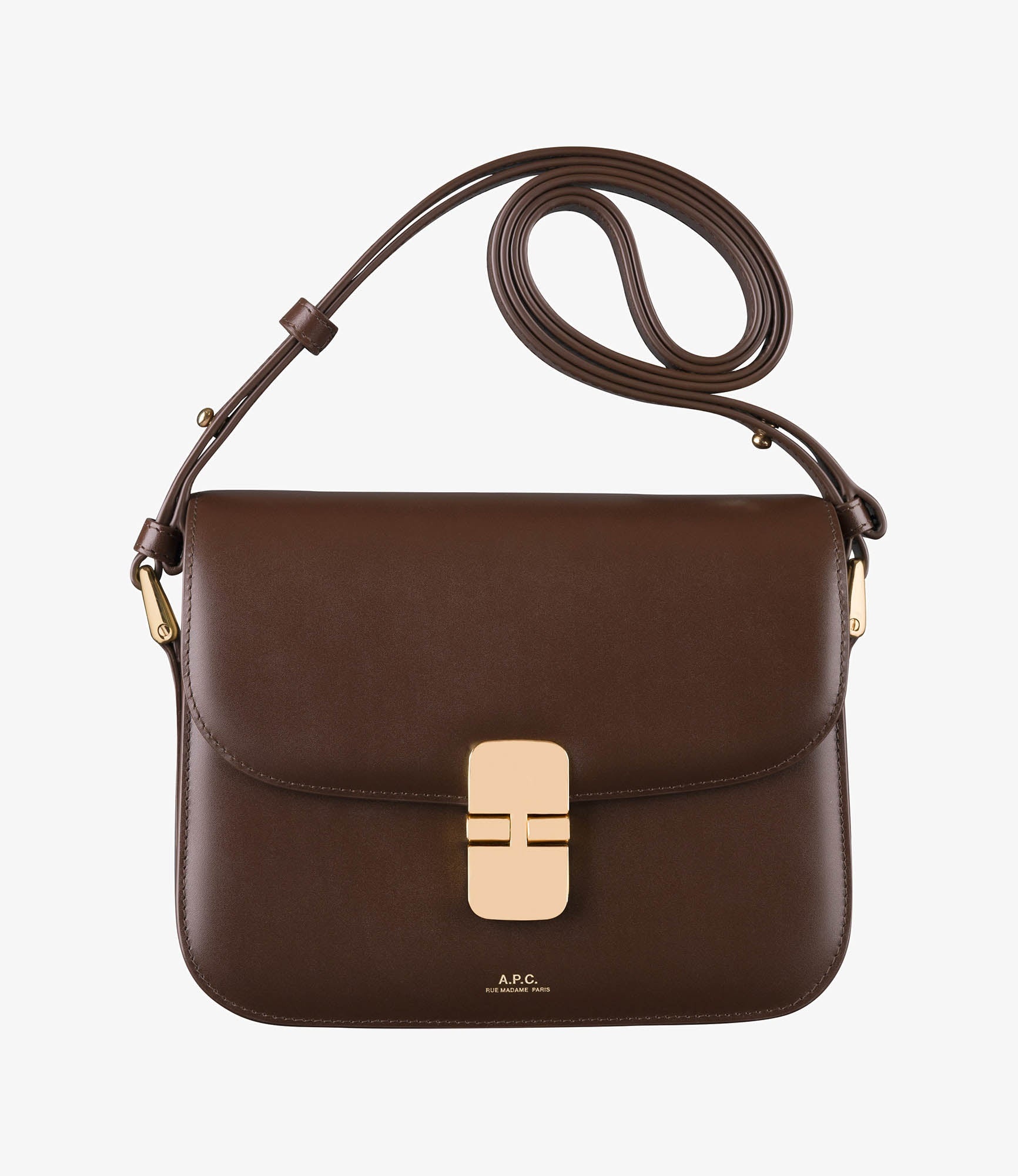 - Leather bag inspired by chic vintage bags in a small format. - Supple cowhide leather. - Adjustable leather shoulder strap. - Can be worn on the shoulder or across the chest. - Goldtone clasp. - Flap lining in cowhide suede split. - One large compartment. - Two large pockets. - Two goldtone rings on the sides. - Embossed goldtone A.P.C. Rue Madame Paris logo. Size Advice - Cotton lining. - Dimensions: 8.3 x 6.7 x 2. - Adjustable shoulder strap: 14.2 and 19.3. - Smaller version of the Grace bag and bigger version of the Grace Mini bag. Composition & Material - 100% cowhide leather. - Spanish material. - Made in Morocco. - Care instructions: wipe with a soft dry cloth. - Avoid poor weather conditions which can potentially damage the leather.