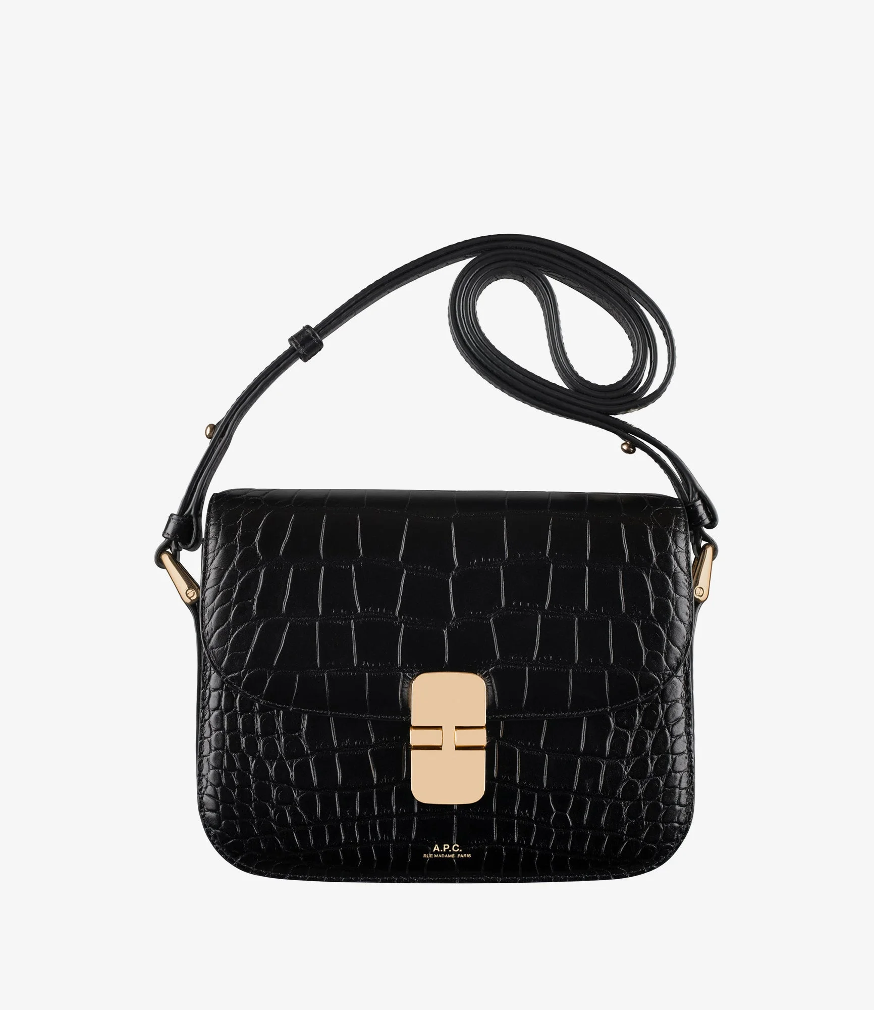 PRODUCT DETAILS Cowhide leather embossed in crocodile motif. Trapezoidal shape. Flap closure with clasp. Calfskin suede lining under flap. Goldtone "A.P.C. Rue Madame Paris" logo embossed on front. Adjustable shoulder strap. One large compartment and two additional ones. Cotton blend lining. Goldtone hardware. May be carried on shoulder or across chest. Dimensions: 8.46 x 6.69 x 1.96 in. 100% cowhide.