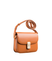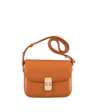 PRODUCT DETAILS A.P.C. Women's bag. - Leather bag inspired by chic vintage bags, in a mini size. - Soft cowhide leather. - Adjustable leather shoulder strap. - Can be worn on the shoulder or across the chest. - Goldtone metal clasp. - Flap lined with cowhide suede split leather. - One large compartment. - Two large pockets. - Two goldtone rings on the sides. - Embossed goldtone 'A.P.C. Rue Madame Paris' logo. FABRIC & CARE - 100% calfskin leather. - Spanish material. - Made in Morocco. - Care instructions: wipe with a soft, dry cloth. SIZE - Dimensions: 8.4 x 6.7 x 2". - Adjustable handle: 36 cm and 49 cm. - Smaller version of the Grace bag and bigger version of the Grace Mini bag.