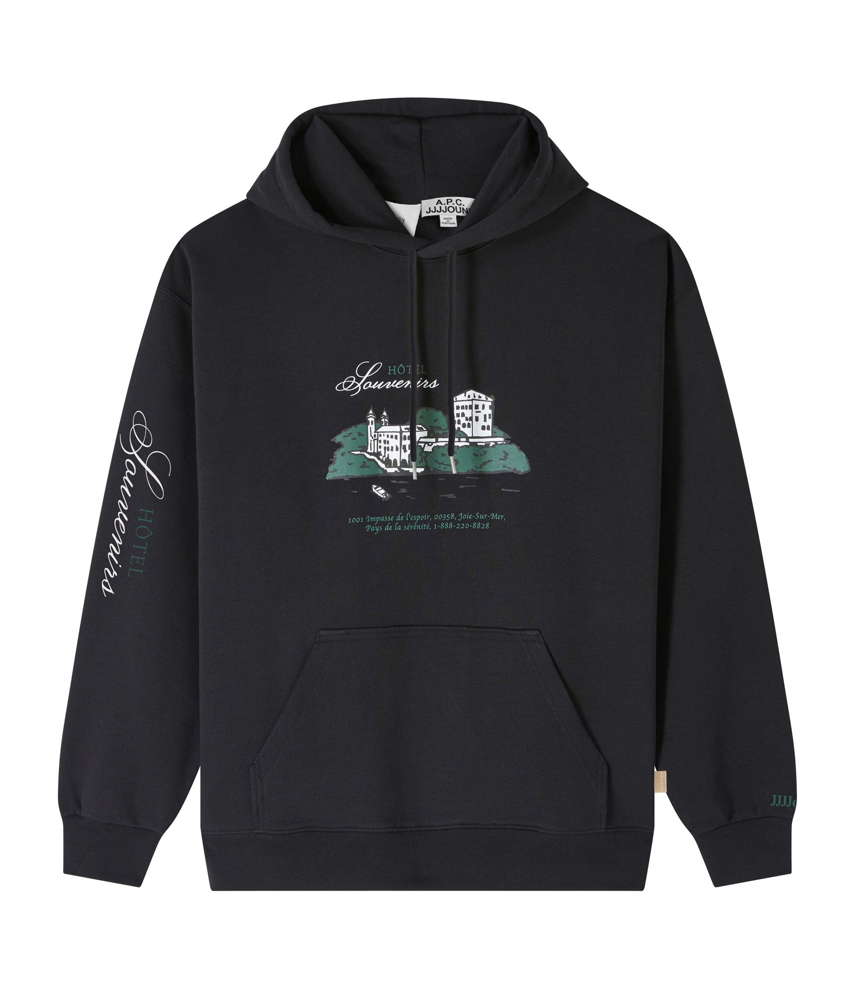 A.P.C. x JJJJound hoodie. - Hotel Souvenirs can be reached at 1-888-220-8828. - Unisex model. - Heavyweight material (350 g). - Loose fit. - Crew neck with fleecy hood and tone-on-tone drawstrings. - Hotel Souvenirs screenprint with illustration on the front and on the right sleeve. - JJJJound embroidered on the bottom of the left sleeve and A.P.C. embroidered on the hood. - A.P.C. JJJJound label on the left side and Hotel Souvenirs label at the neck. - Kangaroo pocket. - 100% organic cotton. Size Advice - Till is 6'2 tall and is wearing size M. Composition & Material - 100% cotton. - Portuguese material. - Made in Portugal. - Machine wash cold (86°F) inside-out.