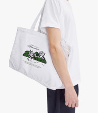A.P.C. x JJJJound tote bag. - Unisex model. - Two large handles to carry the bag by hand or on the shoulder. - One inside pocket. - Hotel Souvenirs screenprint on one side and A.P.C. on the other. - A.P.C. JJJJound label on the side. - 100% organic cotton. Size Advice - Dimensions: 45 x 35.5 x 5.51 . Composition & Material - 100% cotton. - Made in Bulgaria. Our commitments Through its RESPECT program A.P.C reduces (by implementing many practical measures to improve its environmental footprint) regulates (by respecting and enforcing its ethical responsibility on the part of its employees as well as its suppliers) and reuses (through its recycling vintage or quilts and butler programs for example).