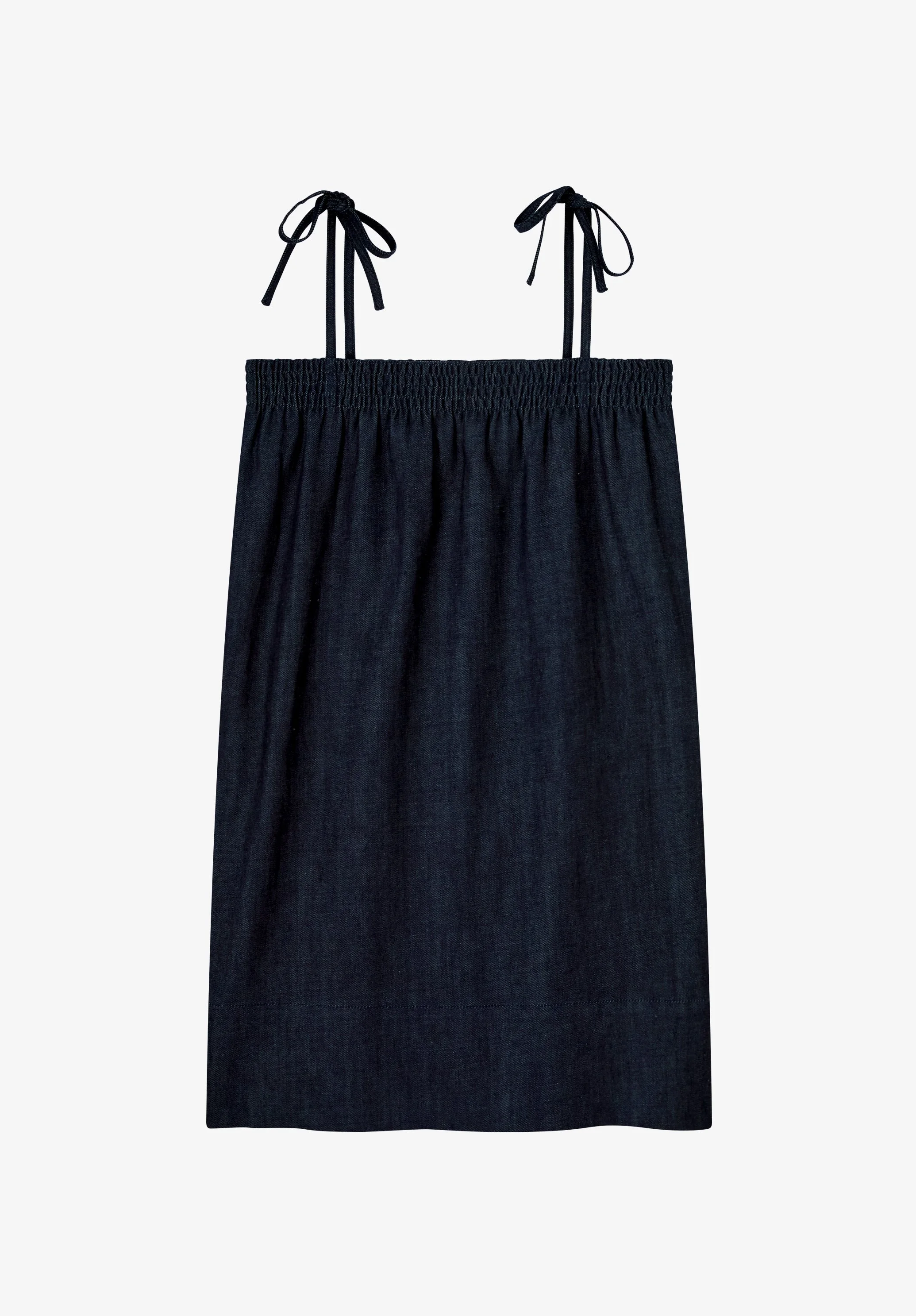 - Lightweight denim material. - Straight cut. - Mid-thigh length. - Tank top drawstrings to tie closed. - Elasticated around the bust. - 100% organic cotton. Size Advice - Ebba is 5'10 tall and is wearing size 36. Composition & Material - 100% cotton. - Japanese material. - Made in China. - Machine wash cold (86°F) inside-out.