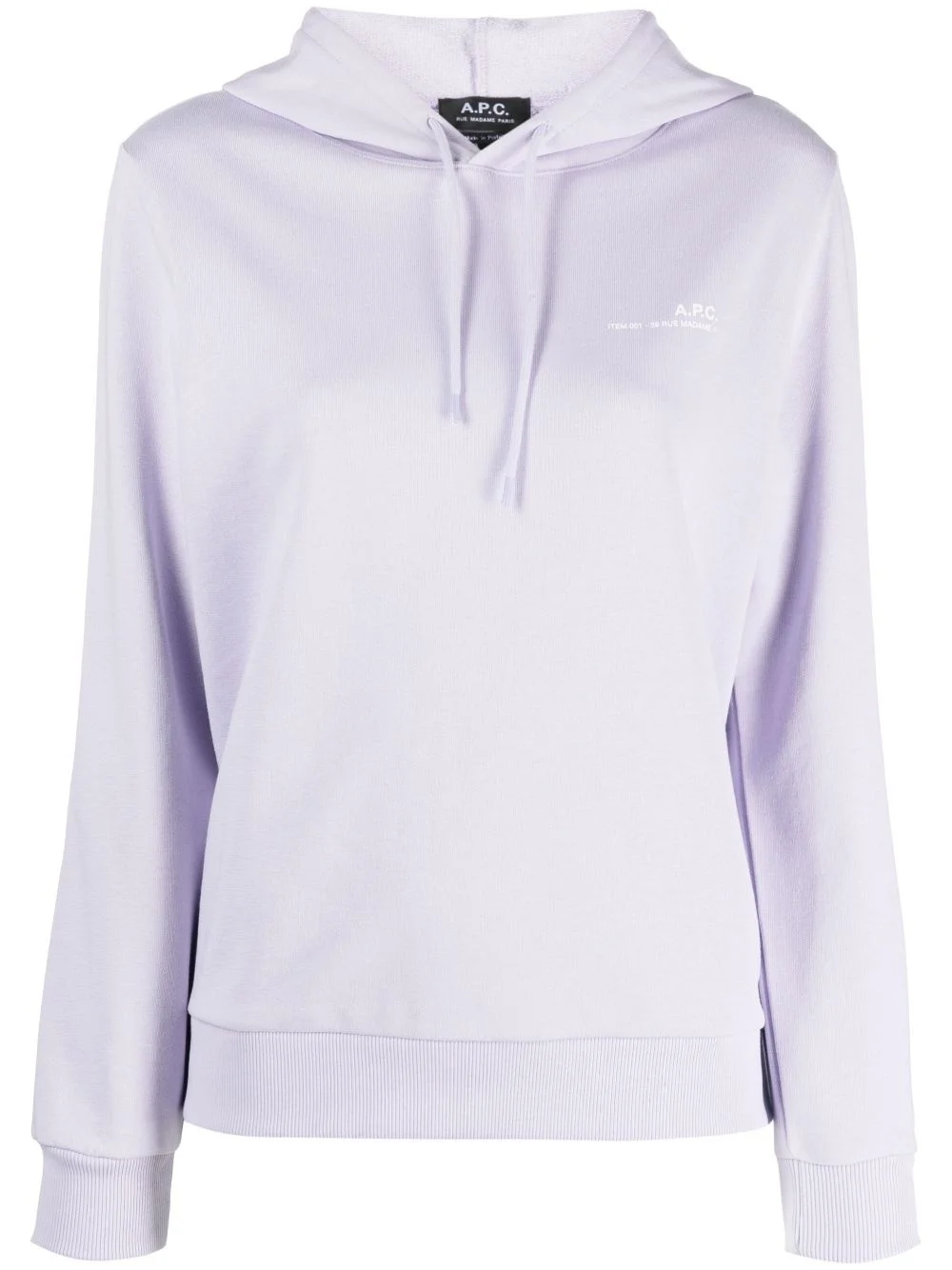 Item cotton hoodie Cut from soft cotton in a sweet lavender shade, this A.P.C. hoodie is simply adorned with a compact 'A.P.C. ITEM 001' logo at the chest. The design speaks to the French label's penchant for creating elevated everyday staples. Highlights - Lavender purple - Cotton - Logo print at the chest - Drawstring hood - Long sleeves - Ribbed edge - Straight hem Imported Composition Cotton 100% SIZE & FIT Model measurements Height 5 ft 10 in(1.78 m) Bust/Chest 33.46 in(85 cm) Hips 36.22 in(92 cm) Waist 23.22 in(59 cm) FittingInformation Designed for a relaxed fit, this piece allows for comfort and movement when worn Made from a midweight non-stretch fabric, this piece offers minimal elasticity when worn This piece fits true to size – take your usual size