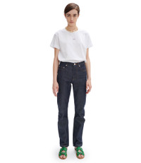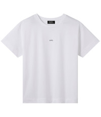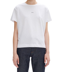 A.P.C. Women's T-shirt. - Loose cut. - Sloping shoulders and wide sleeves. - Black A.P.C. micrologo centered in front. - 100% cotton derived from organic farming. Size Advice - Model is 5'10 tall and is wearing size S. - This item sizes normally. We recommend that you select your usual size. Composition & Material - 100% cotton. - Portuguese material. - Made in Portugal. - Machine wash cold (86°F) inside-out. Our commitments Through its RESPECT program A.P.C reduces (by implementing many practical measures to improve its environmental footprint) regulates (by respecting and enforcing its ethical responsibility on the part of its employees as well as its suppliers) and reuses (through its recycling vintage or quilts and butler programs for example).