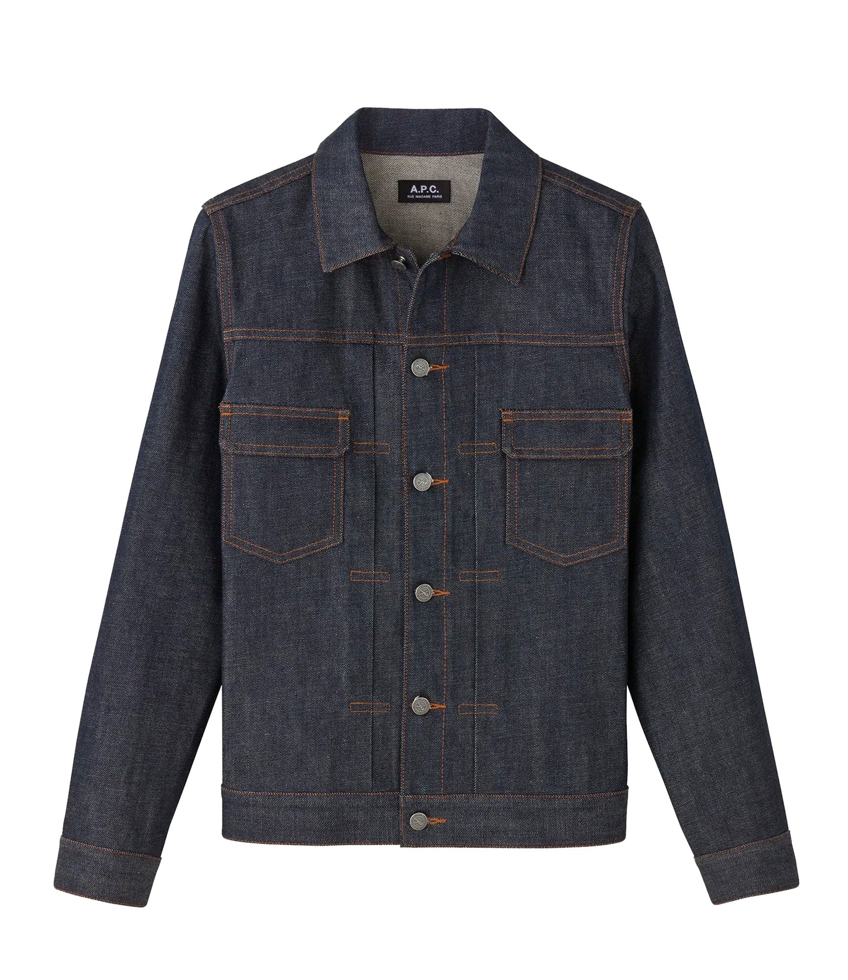 PRODUCT DETAILS Japanese raw denim. Very stiff fabric that wears in over time. 100% Cotton. Straight cut. Button closure. Buttons engraved "A.P.C. rue Madame près du Luxembourg". Two flap chest pockets. Side pockets. Slit cuff with button closure. Small buttoned tabs on back hem. Closure interior trimmed with selvage. Unlined. Orange topstitching. 14.50 oz. Machine wash. Do not tumble dry. The model is 6' 1" and is wearing size M.