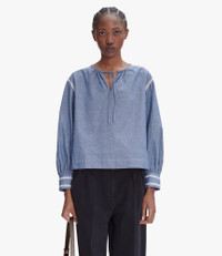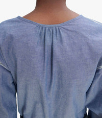 A.P.C. Women's blouse. - Wide short cut. - Bow to tie at the neckline. - Openwork bands on the shoulders and sleeves. - Puff sleeves. - Cuffs with mother-of-pearl buttons. - 100% organic cotton. - Same fabric also available in: Embroidered Boyfriend shirt Size Advice - Grace is 5'10 tall and is wearing size 36. Composition & Material - 100% cotton. - Portuguese material. - Made in Tunisia. - Machine wash cold (86°F) inside-out.