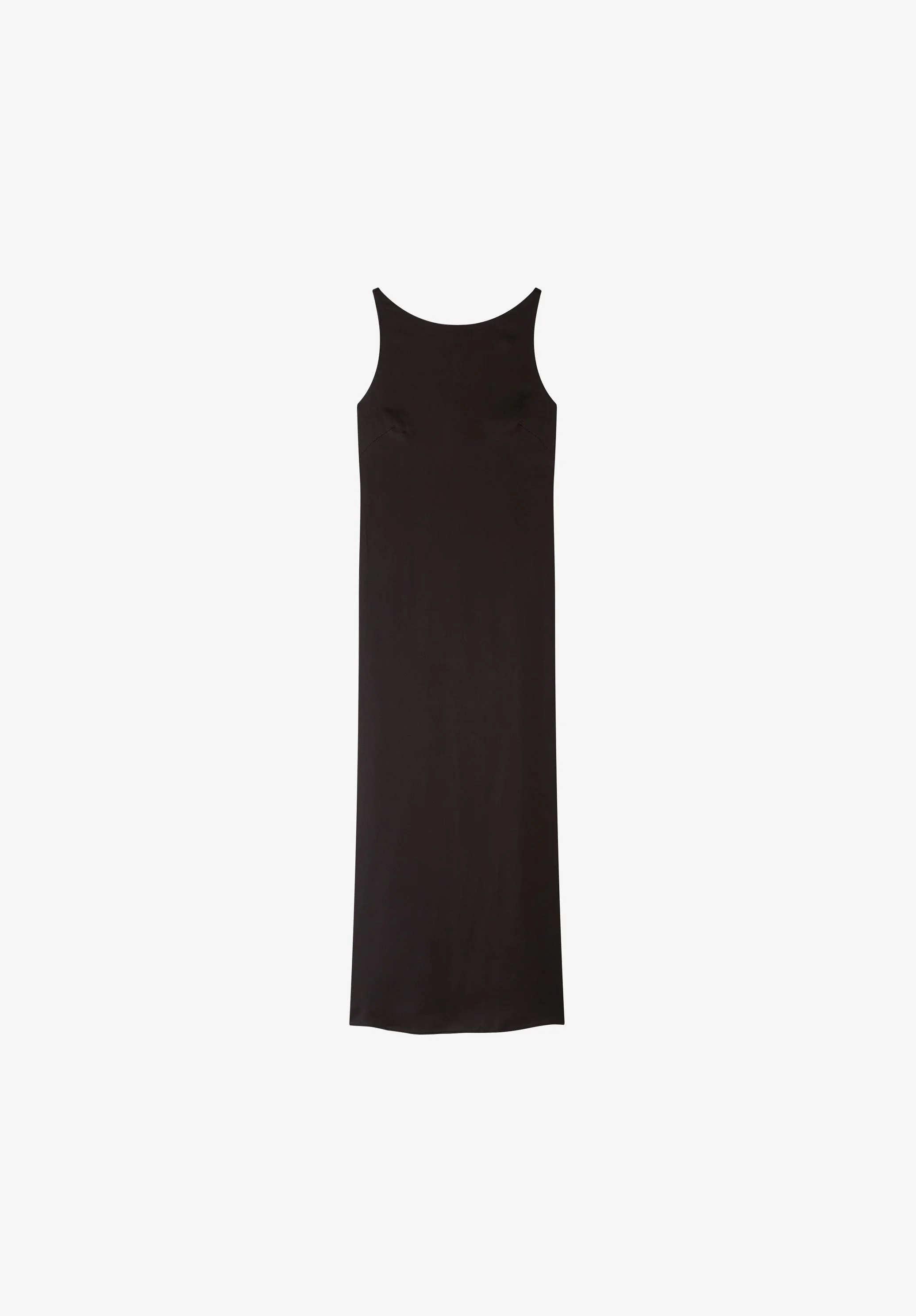 A.P.C. Women's dress. - Flowing satiny material. - Straight cut. - Ankle length. - Wide neckline. - Spaghetti straps in back. - Bust darts. - Backless. - Tone-on-tone viscose lining. - 100% viscose from FSC (Forest Stewardship Council) forests. Size Advice - Sofi is 5'10 tall and is wearing size 36. Composition & Material - 100% viscose. - Italian material. - Made in Tunisia. - Dry clean.