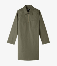 - Workwear-style material. - Straight cut. - Above-knee length. - Classic zip collar. - One pocket over the heart and two pockets on the sides. Size Advice - Grace is 5'10 tall and is wearing size 36. Composition & Material - 100% cotton. - Italian material. - Made in Tunisia. - Machine wash cold (86°F) inside-out.