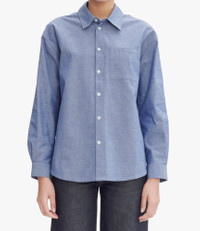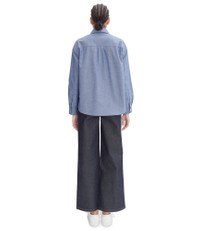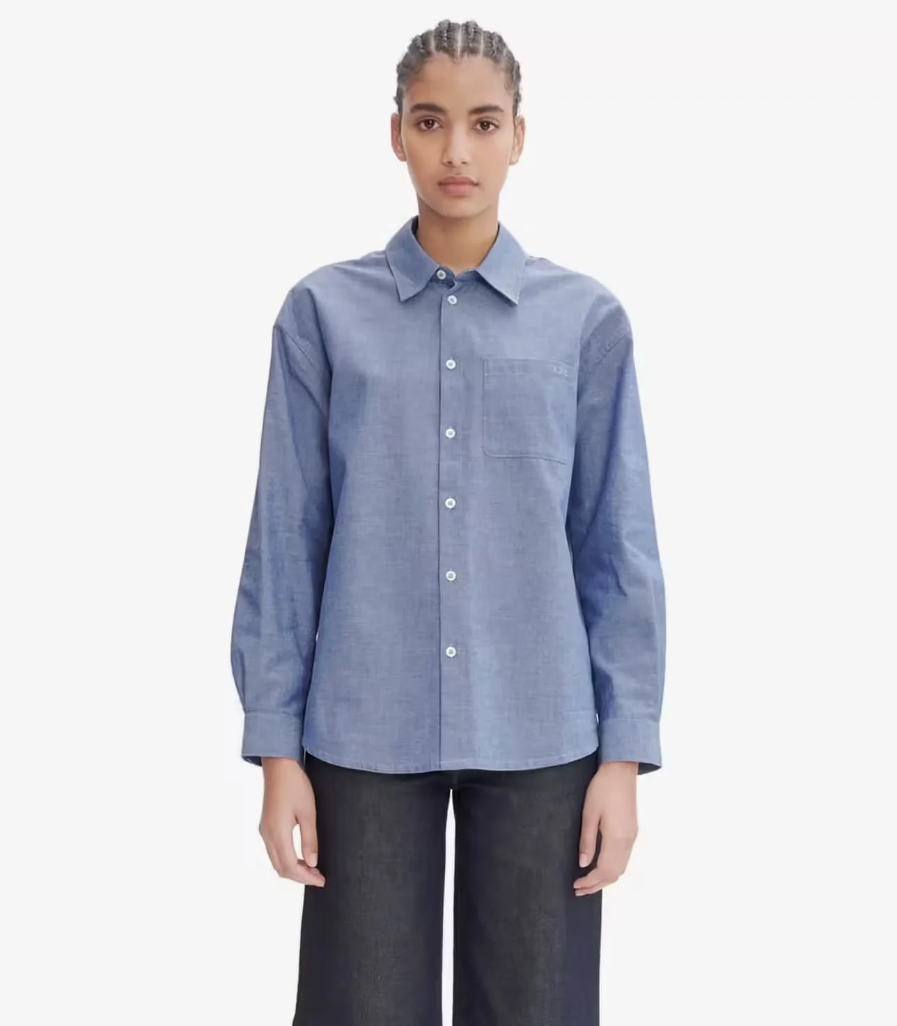 A.P.C. Women's shirt. - Loose fit. - Classic collar. - One pocket over the heart. - Tone-on-tone A.P.C. logo embroidered on the pocket. - White mother-of-pearl buttons. - Same fabric also available in: Joy blouse Size Advice - Model is 5'9 and wearing size 36. Composition & Material - 100% cotton. - Portuguese material. - Made in Morocco. - Machine wash cold (86°F) inside-out.