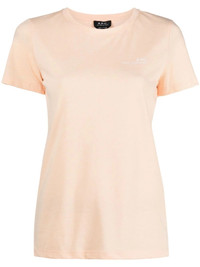 logo-print T-shirt A.P.C.'s T-shirt showcases the power of the logo tee. This peach iteration is embroidered with the brand's signature at the chest. Imported Composition Polyester 65%, Cotton 35% SIZE & FIT Model measurements Height 5 ft 10 in(1.77 m) Bust/Chest 31.49 in(80 cm) Hips 33.85 in(86 cm) Waist 22.44 in(57 cm) FittingInformation This piece fits true to size. We recommend you get your regular size Cut for a relaxed fit Made with a mid-weight fabric Washing instructions Machine Wash