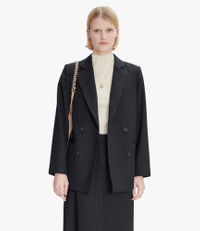 - Chic flowing material. - Straight cut. - Notch lapels. - Double-breasted closure with faux horn buttons. - One pocket over the heart and two on the sides. - Jacquard lining. - Shoulder pads. - Felt undercollar. - Wear with the Joseon pants. Size Advice - Ireen is 5'10 tall and is wearing size 36. Composition & Material - 100% wool. - Portuguese material. - Made in Bulgaria. - Dry clean only.