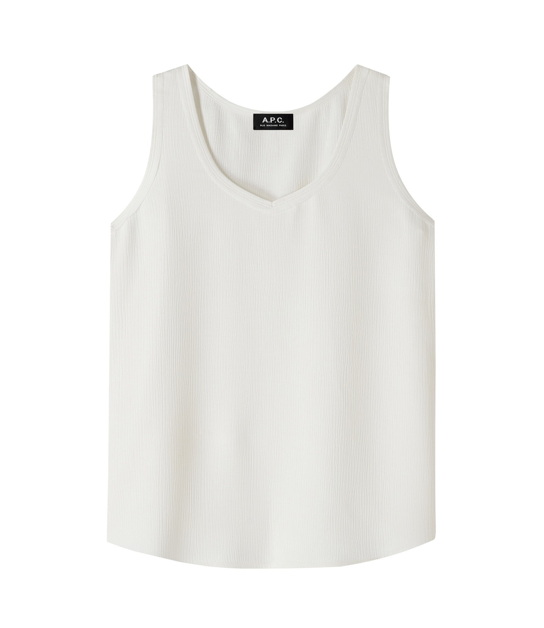 - Thick crepe material. - Flared cut. - V neckline. - Contrasting trim at neckline and armholes. - Composed of 85% EcoVero viscose: sturdy breathable viscose from forests certified durable. Size Advice - Britt is 5'10 tall and is wearing size 36. Composition & Material - 85% Viscose. 15% Polyamide. - Made in Tunisia. - Machine wash 86°F inside-out. Our commitments Through its RESPECT program A.P.C reduces (by implementing many practical measures to improve its environmental footprint) regulates (by respecting and enforcing its ethical responsibility on the part of its employees as well as its suppliers) and reuses (through its recycling vintage or quilts and butler programs for example).