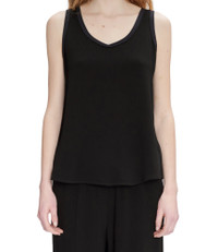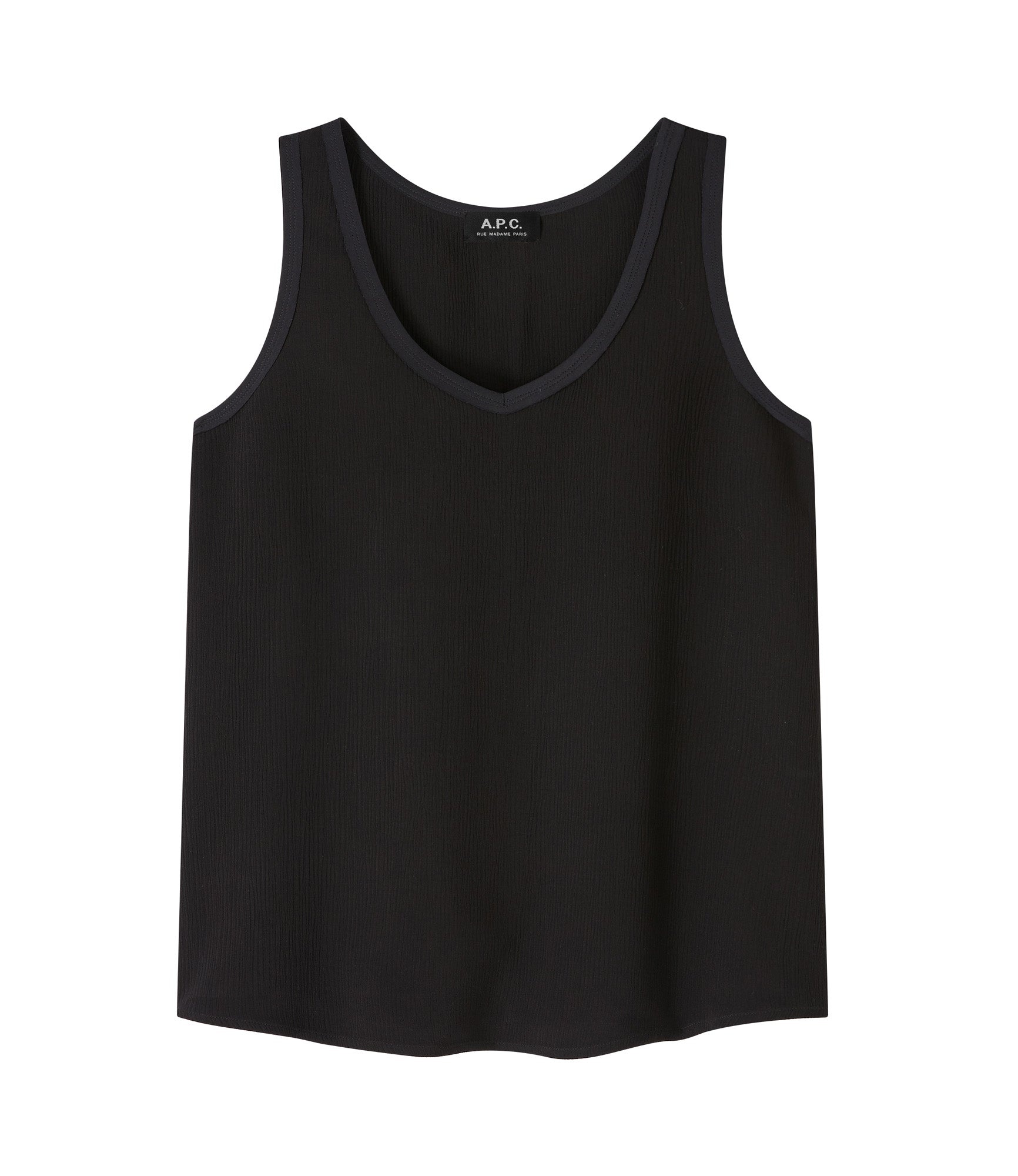 - Thick crepe material. - Flared cut. - V neckline. - Contrasting trim at neckline and armholes. - Composed of 85% EcoVero viscose: sturdy breathable viscose from forests certified durable. Size Advice - Britt is 5'10 tall and is wearing size 36. Composition & Material - 85% Viscose. 15% Polyamide. - Made in Tunisia. - Machine wash 86°F inside-out. Our commitments Through its RESPECT program A.P.C reduces (by implementing many practical measures to improve its environmental footprint) regulates (by respecting and enforcing its ethical responsibility on the part of its employees as well as its suppliers) and reuses (through its recycling vintage or quilts and butler programs for example).