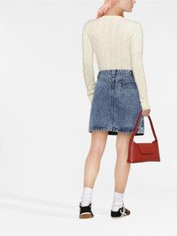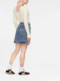 Manue denim mini skirt from A.P.C. featuring blue, cotton, bleach wash, rear welt pocket, two front flap pockets, belt loops and front button fastening. Imported Composition Cotton 100%