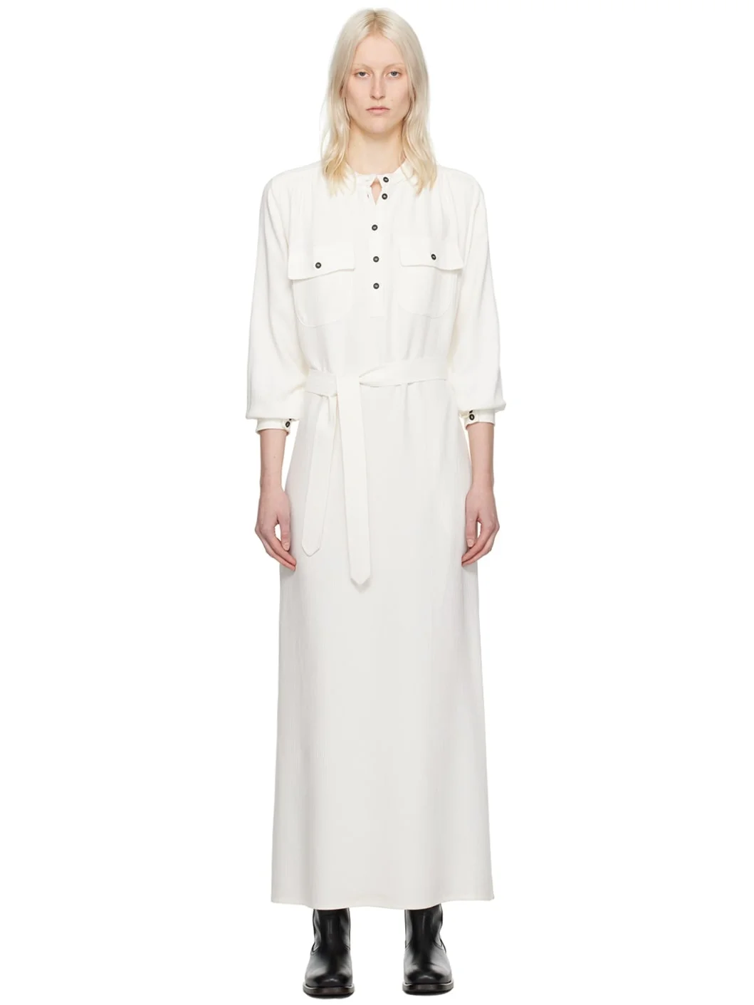 Viscose crepon dress. Gathering throughout. · Band collar · Five-button placket · Flap pockets at chest · Detachable self-tie belt · Seam pockets · Vented side seams · Two-button barrel cuffs Supplier color: Off white 100% viscose. Made in Tunisia 241252F055001
