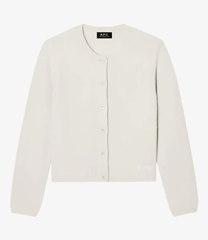 A.P.C. Women's sweater. - Soft warm and thick material. - Straight slightly cropped cut. - Crew neck. - Contrasting A.P.C. logo at lower left. - Six tone-on-tone corozo buttons. Size Advice null Composition & Material - 100% wool. - Made in China. - Machine wash delicate cycle or by hand.