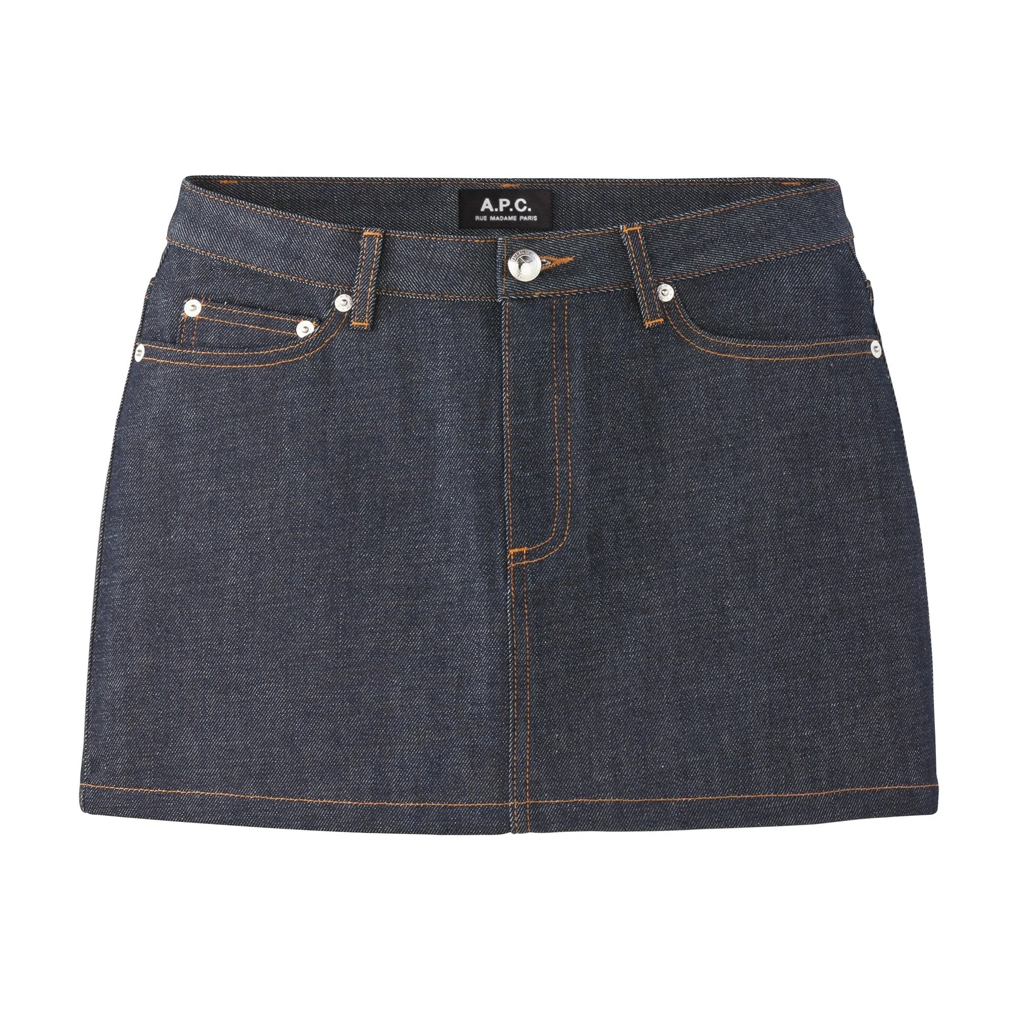 A.P.C. Women's skirt. - Fits slim due to stiffness of fabric. Please size up 1 for regular fit. - Very short cut slightly flared. - Zipped fly and a button on the waistband engraved A.P.C. rue Madame pres du Luxembourg . - Very rigid denim that softens over time. - Caramel stitching. Size Advice - Millie is 5'9 tall and is wearing size 26. - Fits slim due to stiffness of fabric. Please size up 1 for regular fit. Composition & Material - 100% cotton. - Japanese material. - Made in Vietnam. - Machine wash 86°F inside-out. - Spin dry at minimum speed. - Do not tumble dry. - The jeans may appear to shrink after washing but will regain their shape when worn.