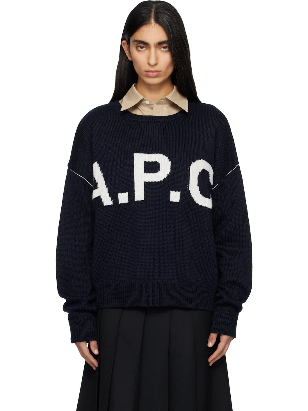 Knit wool-blend sweater. · Rib-knit crewneck, hem, and cuffs · Jacquard logo at chest · Dropped shoulders Supplier color: Dark navy 50% wool, 50% acrylic. Made in Romania 261252F096000