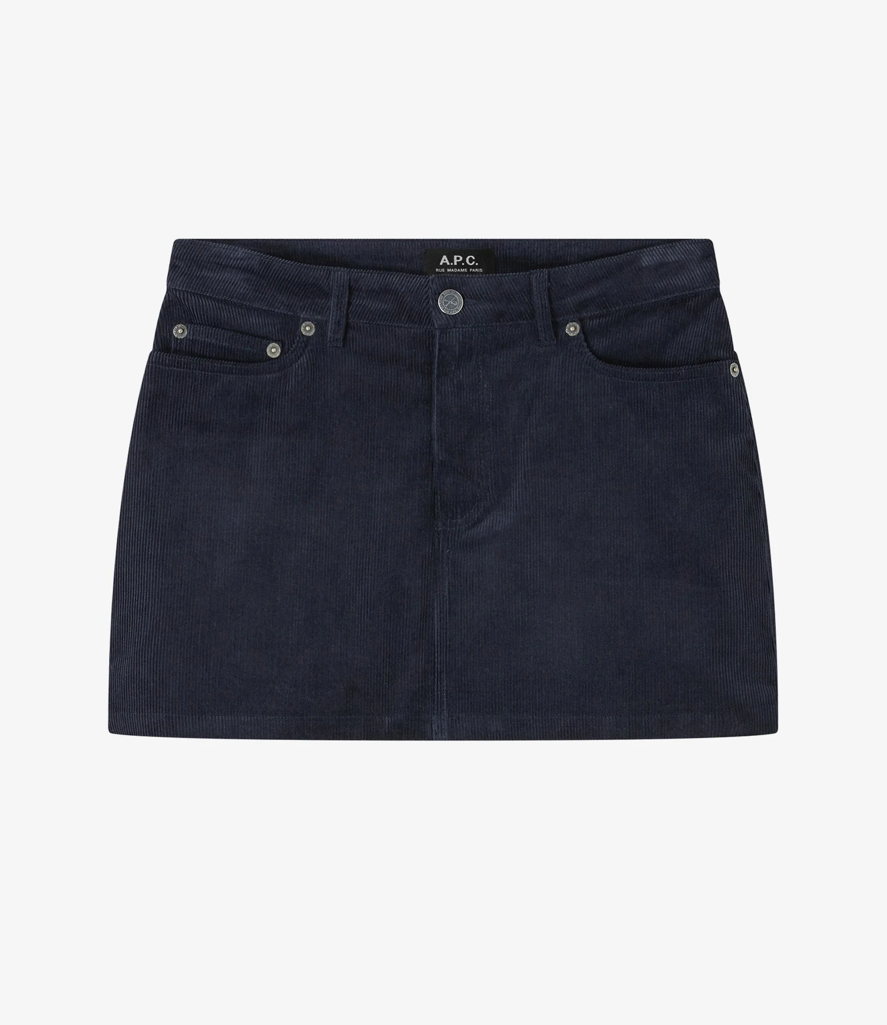 - Very short cut slightly flared. - High rise. - Zip fly. Button at waist engraved A.P.C. rue Madame pres du Luxembourg. - Tone-on-tone topstitching. Size Advice - Grace is 5'10 tall and is wearing size 36. Composition & Material - 100% cotton. - Italian material. - Made in Tunisia. - Machine wash cold (86°F) inside-out.