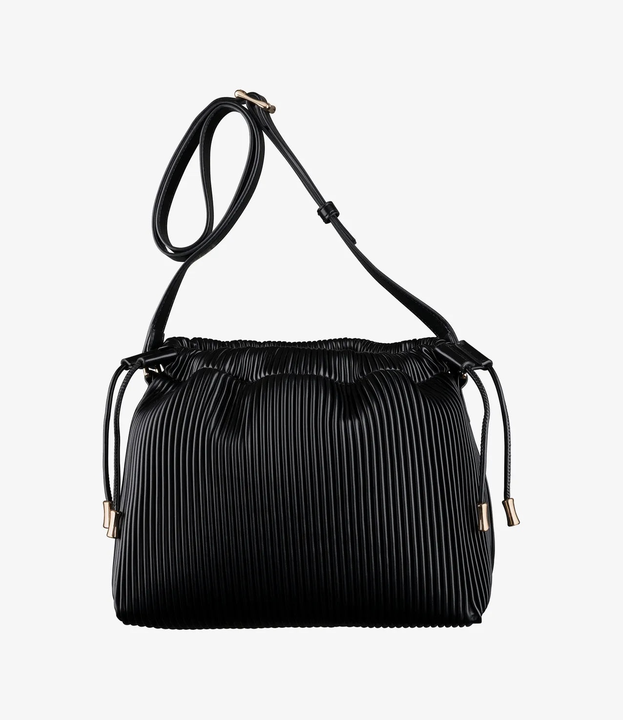 - Pleated leather. - Magnetic inside closure. - Drawstring closure on the top. - Shoulder strap to wear the bag on the shoulder or across the chest. - One inside pocket. - Goldtone A.P.C. rue Madame Paris logo embossed on the front. Size Advice - Dimensions: 21 x 26 x 14 cm. Composition & Material - 55% polyurethane. 40% polyester. 5% calcium carbonate. - Made in China. - Care instructions: wipe with a soft dry cloth.