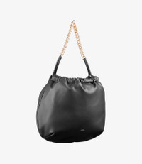 A.P.C. Women's bag. - Recycled leather-like material. - Magnetic inside closure. - Drawstring on top connected to the handles. - Goldtone metal chain. - Can be carried by hand or on the shoulder. - One interior pocket. - Goldtone 'A.P.C. Rue Madame Paris' logo embossed on front. - In the Ninon product line. Size Advice - Dimensions: 15 x 8.7. Composition & Material - 60% polyurethane. 40% polyester. - Made in China. - Care instructions: wipe with a soft dry cloth.