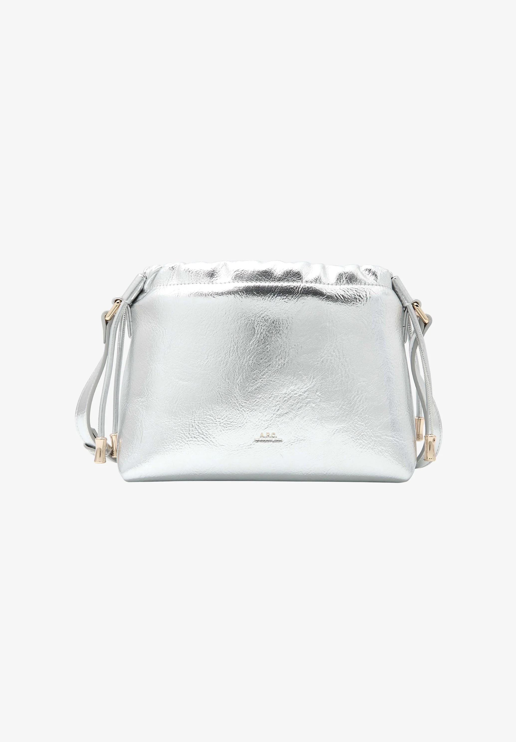 - Crinkled recycled leather-like material. - Magnetic inside closure. - Drawstring closure on top. - Shoulder strap to wear the bag on the shoulder or across the chest. - One inside pocket. - Embossed goldtone A.P.C. rue Madame Paris logo on front. - In the Ninon product line. Size Advice - Dimensions: 6.7 x 8.2 x 3.9. Composition & Material - 55% polyurethane. 40% polyester. 5% calcium carbonate. - Made in Hong Kong. - Care instructions: wipe with a soft dry cloth.