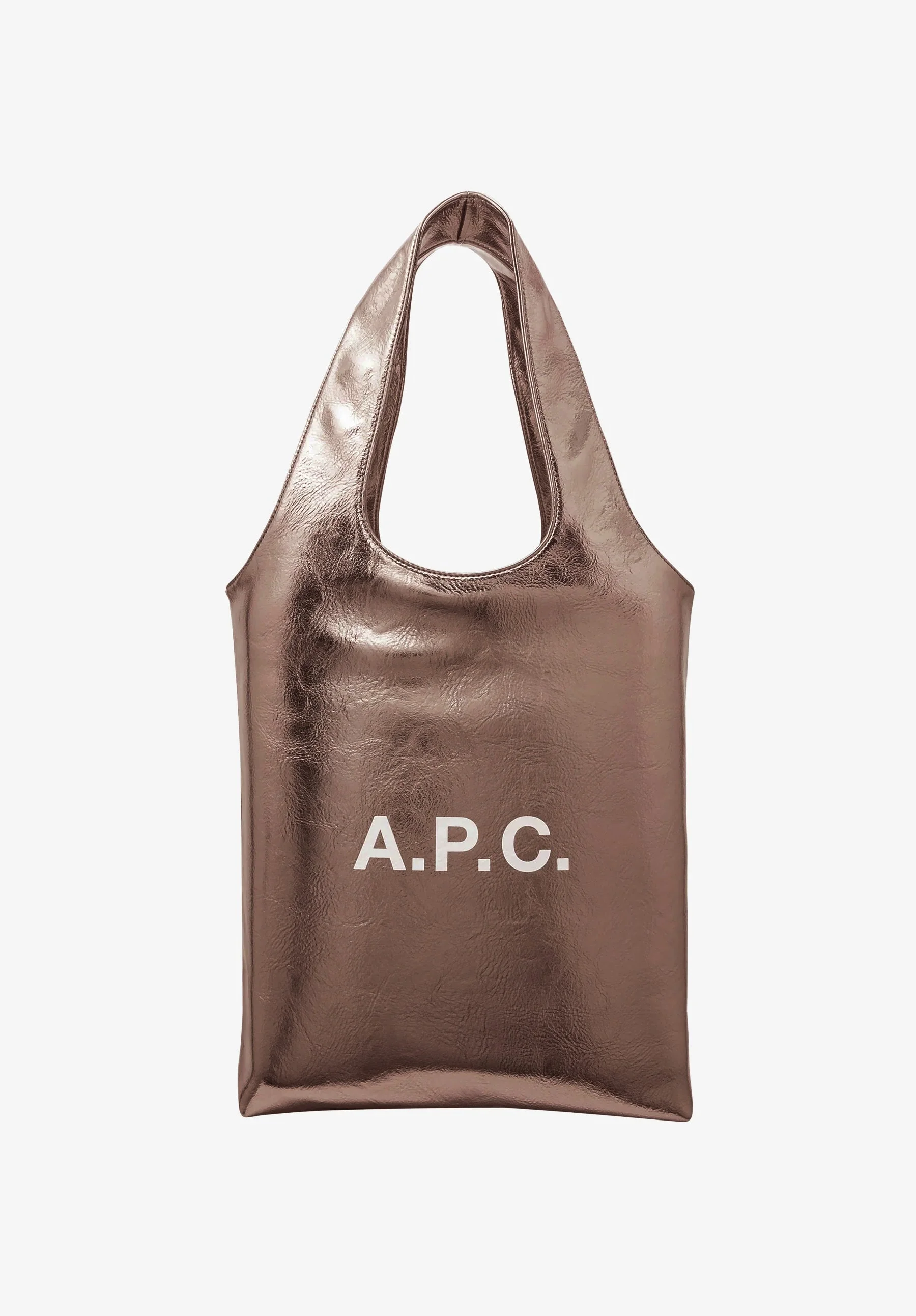 - Unisex piece. - Metallised recycled leather-like material. - Two large handles to carry the bag by hand or on the shoulder. - One inside pocket. - White A.P.C. logo. Size Advice - 55% polyurethane. 40% polyester. 5% calcium carbonate. - Made in China. - Care instructions: wipe with a soft dry cloth. - Dimensions: 34 x 53 x 11 cm. - Small version of the Ninon tote bag. Composition & Material - 88% polyurethane. 8% wood. 4% other fibres. - Made in China. - Care instructions: wipe with a soft dry cloth.