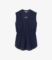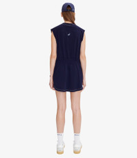 A.P.C. x Asics dress. - Includes interior shorts in navy color. - Moisture-wicking stretch material designed for movement. - Straight flowing cut. - Round neckline with contrasting double topstitching. - Sleeves cut at the shoulder. - A.P.C. and Asics logo in front. - Elasticated waistband. - Slit skirt. - 35% recycled polyester. Size Advice - Kelsey is 5'10 tall and is wearing size S. Composition & Material - 100% polyester. - Made in China. - Machine wash cold (86°F) inside-out.