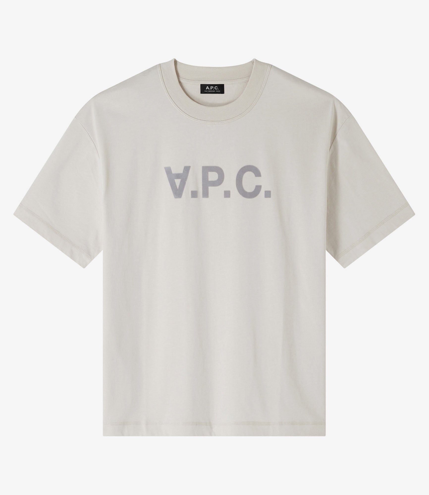 - Unisex piece. - Oversized cut. - Crew neck. - Pale gray velvety flocked V.P.C. logo. - 100% organic cotton. Size Advice - Ireen is 5'10 tall and is wearing size S. - For women we recommend that you order one size smaller than usual. Composition & Material - 100% cotton. - Portuguese material. - Made in Portugal. - Machine wash cold (86°F) inside-out.