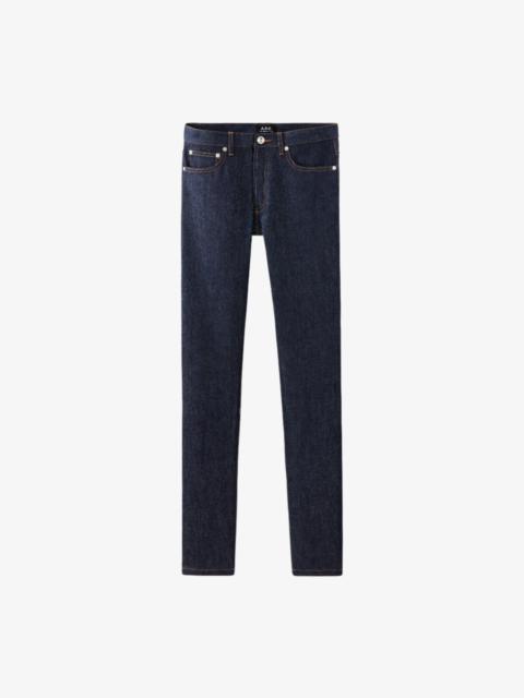 A.P.C. jeans. - Unisex model. - Mid-rise. - Softer denim than raw denim. - Fitted leg. - Button fly. - Caramel topstitching. Size Advice - Zang is 6'1 tall and is wearing size 30. Composition & Material - 98% cotton. 2% polyurethane. - Japanese material. - Made in Vietnam. - Machine wash cold (86°F) inside-out. - Spin dry at minimum speed. - Do not tumble dry. - These jeans may seem shrunken after washing but they return to their original shape when worn.