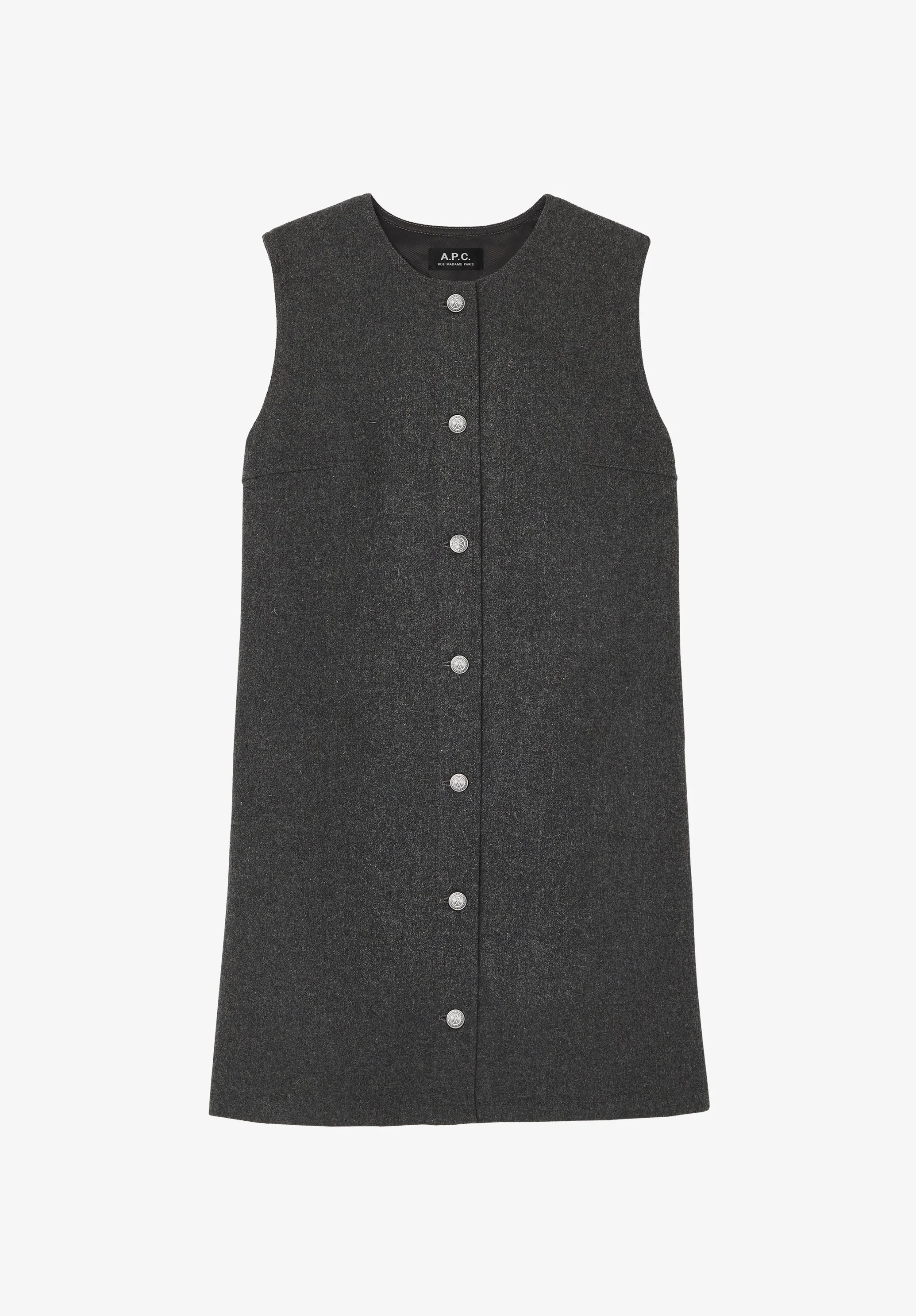 - Structured material. - Straight cut. - Mid-thigh length. - Crew neck. - Button closure in front. Size Advice - Jeanne is 5'10 tall and is wearing size 36. Composition & Material - 100% wool. - Portuguese material. - Made in Bugaria. - Hand wash or delicate cycle.