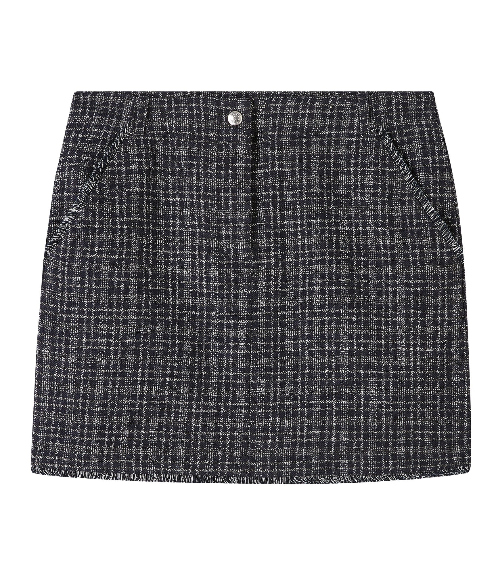 A.P.C. Women's skirt. - Straight cut. - Mid-thigh length. - Narrow fringe at pocket openings. - Zip fly. A.P.C. 'guitar and dagger' button. - Black viscose lining. - May be worn with Stella jacket. Size Advice - Britt is 5'10 tall and is wearing size 36. - This model fits true to size; choose your usual size. Composition & Material - 41% Cotton. 29% Viscose. 28% Polyester. 2% Other fibers. - Italian material. - Made in Bulgaria. - Dry clean. Our commitments Through its RESPECT program A.P.C reduces (by implementing many practical measures to improve its environmental footprint) regulates (by respecting and enforcing its ethical responsibility on the part of its employees as well as its suppliers) and reuses (through its recycling vintage or quilts and butler programs for example).