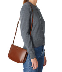 A.P.C. Women's bag. - Double-pouch bag in smooth leather. - Premium cowhide leather. - Adjustable leather shoulder strap. - Can be worn on the shoulder or across the chest. - Two zip closures opposite each other. - One interior pocket. - Convex rounded bottom corners. - Embossed goldtone 'A.P.C. Rue Madame Paris' logo. Size Advice - Dimensions: 9.8 x 7.1 x 1.9. - Strap: 20.9. Composition & Material - 100% leather. - Spanish material. - Made in Morocco. - Cotton lining. - Vegetable-tanned leather is produced with natural tannins. - Marks and traces that will develop on the leather are normal and are part of its natural patina process. Light colours will darken as well. - Leather must be protected from the sun heat and water. - Care instructions: wipe with a soft dry cloth.