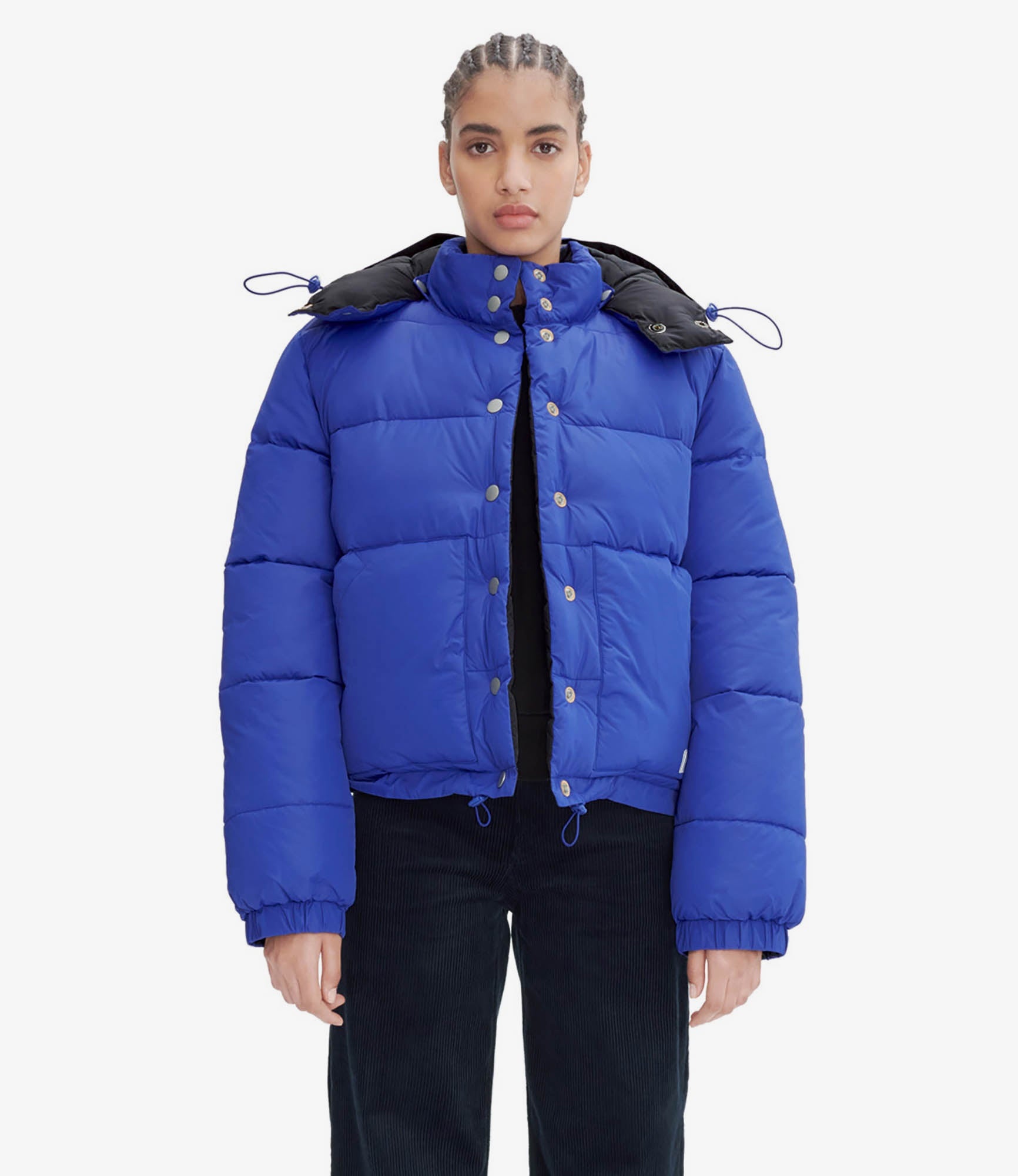 - Warm puffy padded material. - Cropped cut with a loose fit. - High collar. - Removable hood with drawstrings and stopper and a high collar with snap buttons. - Snap closure. - Silicone A.P.C. patch on lower left. - Drawstrings with stoppers at the bottom. - Elasticated wrists. - 100% GRS-certified recycled material (Global Recycled Standard): label that certifies the quality of textiles with over 50% recycled fibers and ensures a rigorous verification of raw materials as well as social and environmental practices. Size Advice - Julie is 5'9 tall and is wearing size 36. Composition & Material - 100% nylon. - Made in China. - Dry clean only.