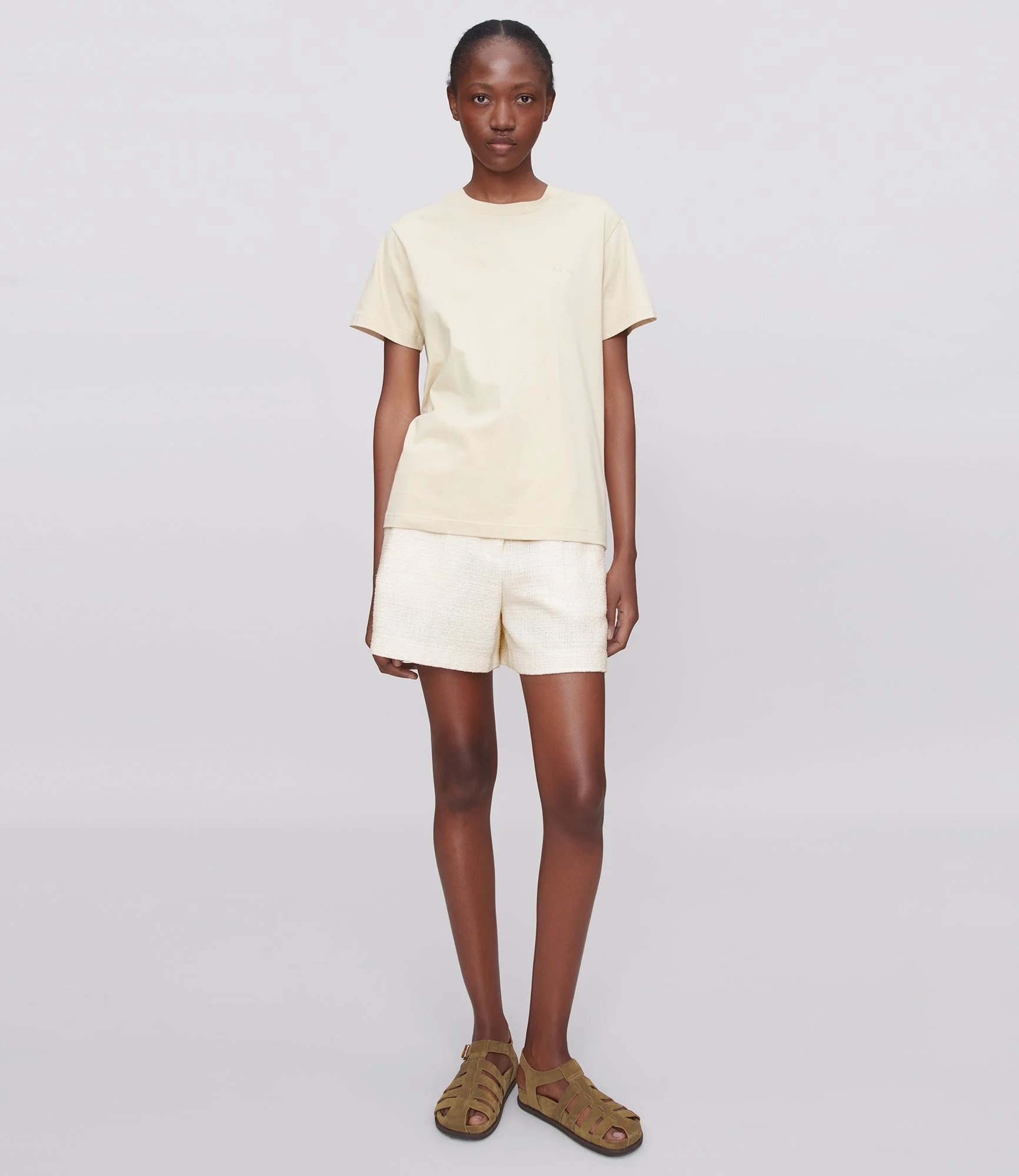 - Unisex piece. - Straight cut. - Crew neck. - Tone-on-tone A.P.C. embroidered over the heart. - This garment is GOTS-certified which guarantees the organic origin of this clothing and the compliance with strict social and environmental criteria throughout the production chain. - GOTS-certified product (No. 214416/EGL) - Organic textile. Size Advice - Grace is 5'10 tall and is wearing size XS. - Leo is 6'1 tall and is wearing size M. - For women we recommend that you order one size smaller than usual. - For others this item sizes normally. We recommend that you select your usual size. Composition & Material - 100% cotton. - Portuguese material. - Made in Portugal. - Machine wash cold (86°F) inside-out.